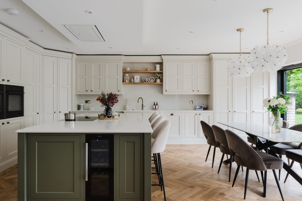 Painted in the timeless duo of Willow and Shell, this family kitchen balances everyday life with refined design details. At its heart, a spacious island provides the perfect spot for…