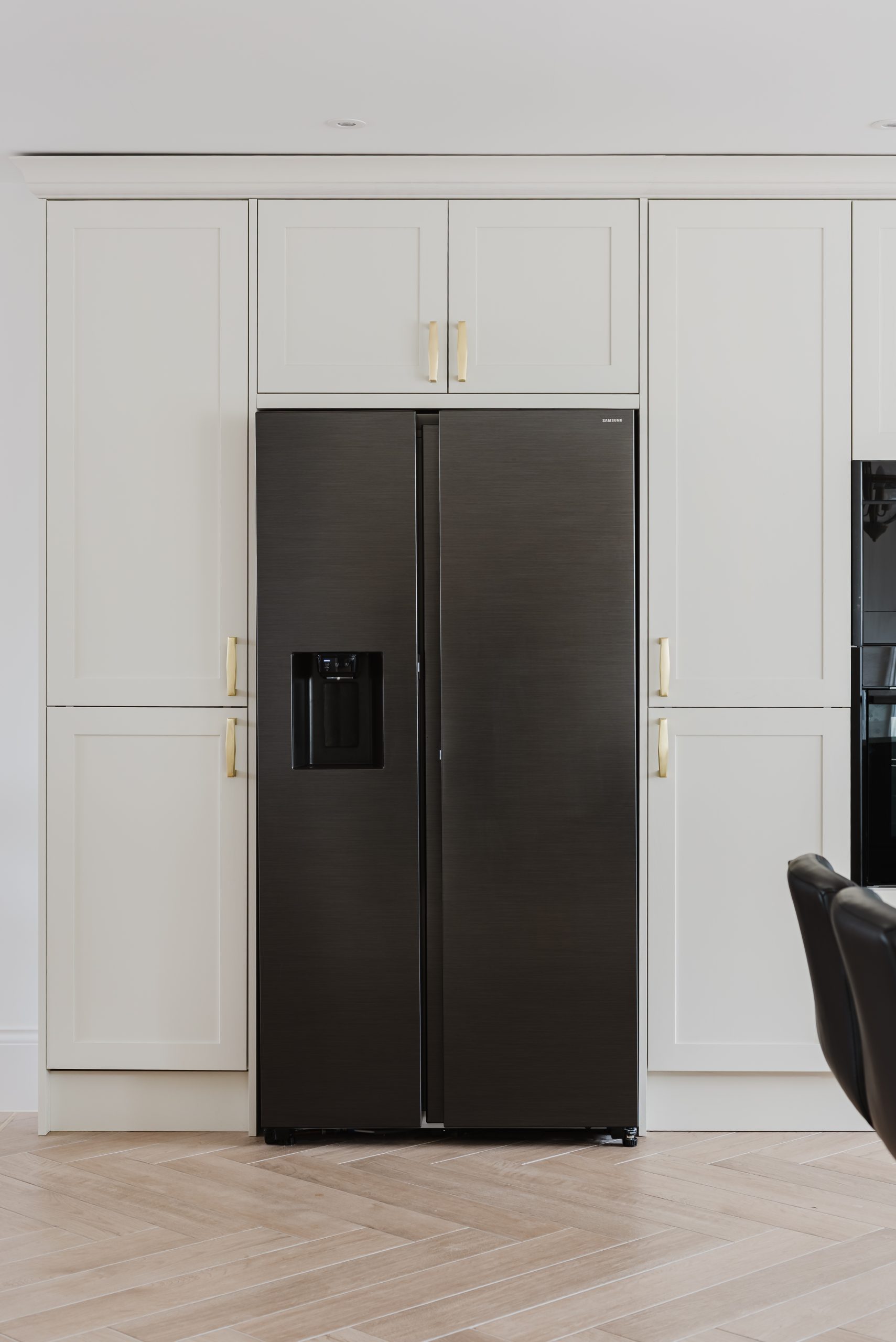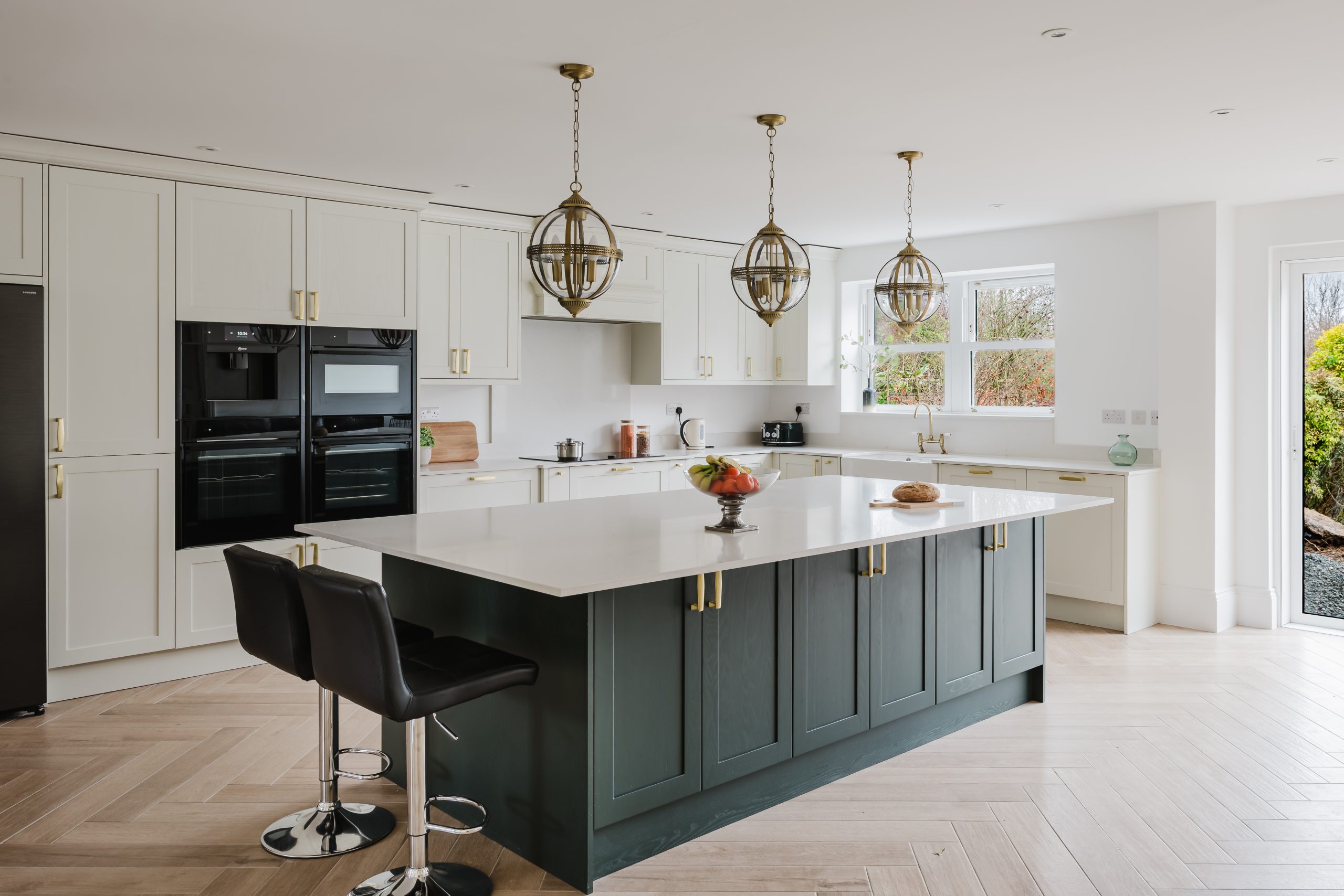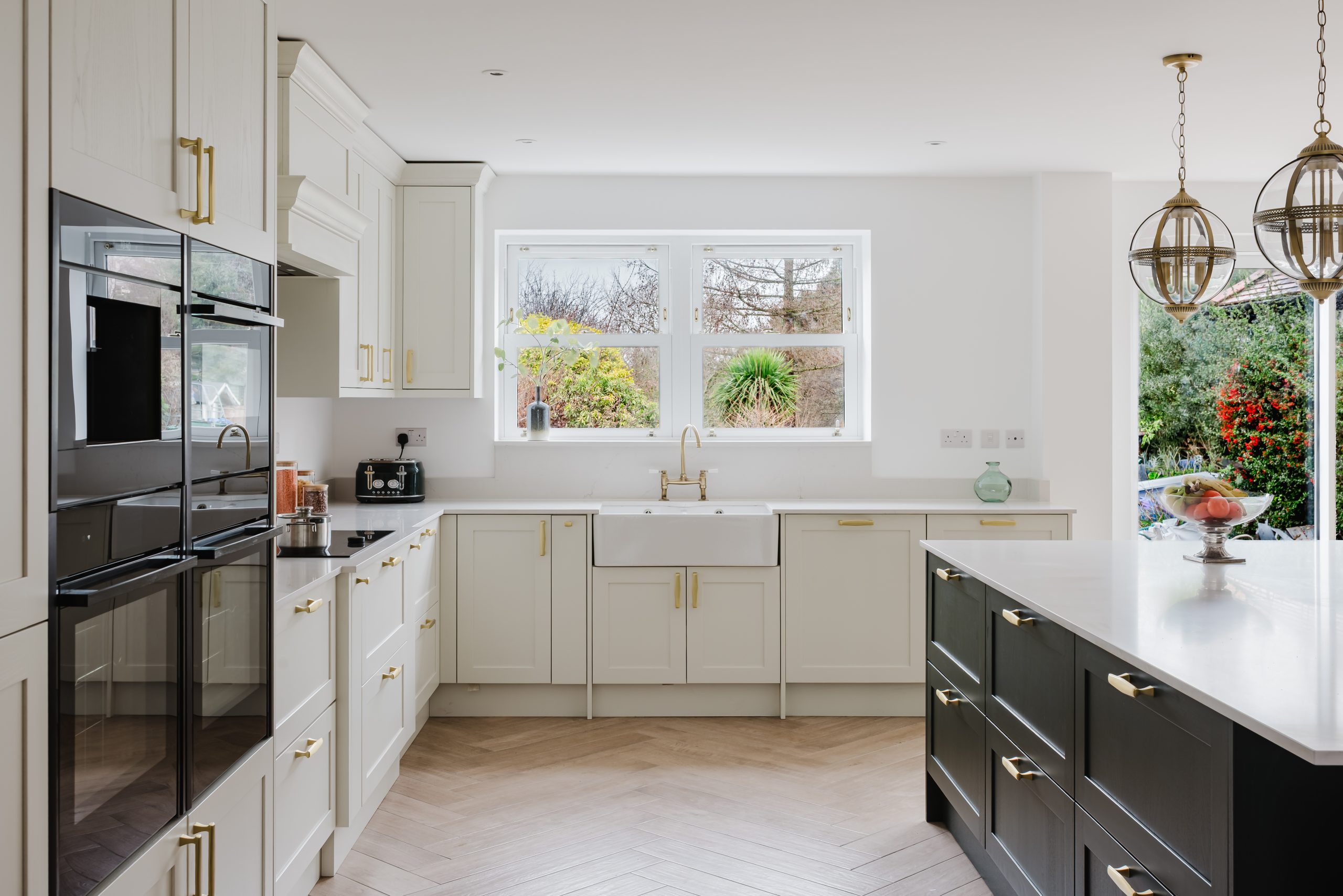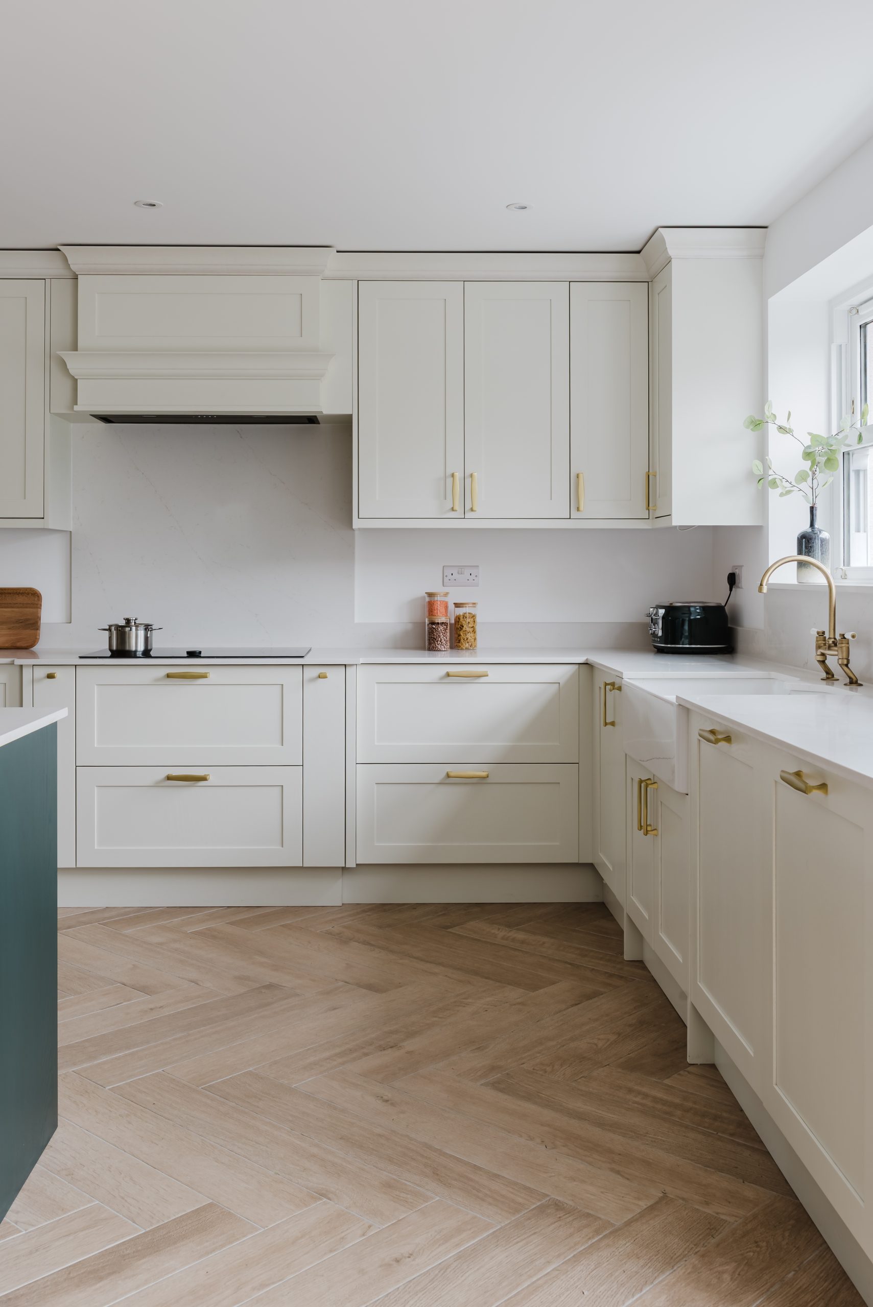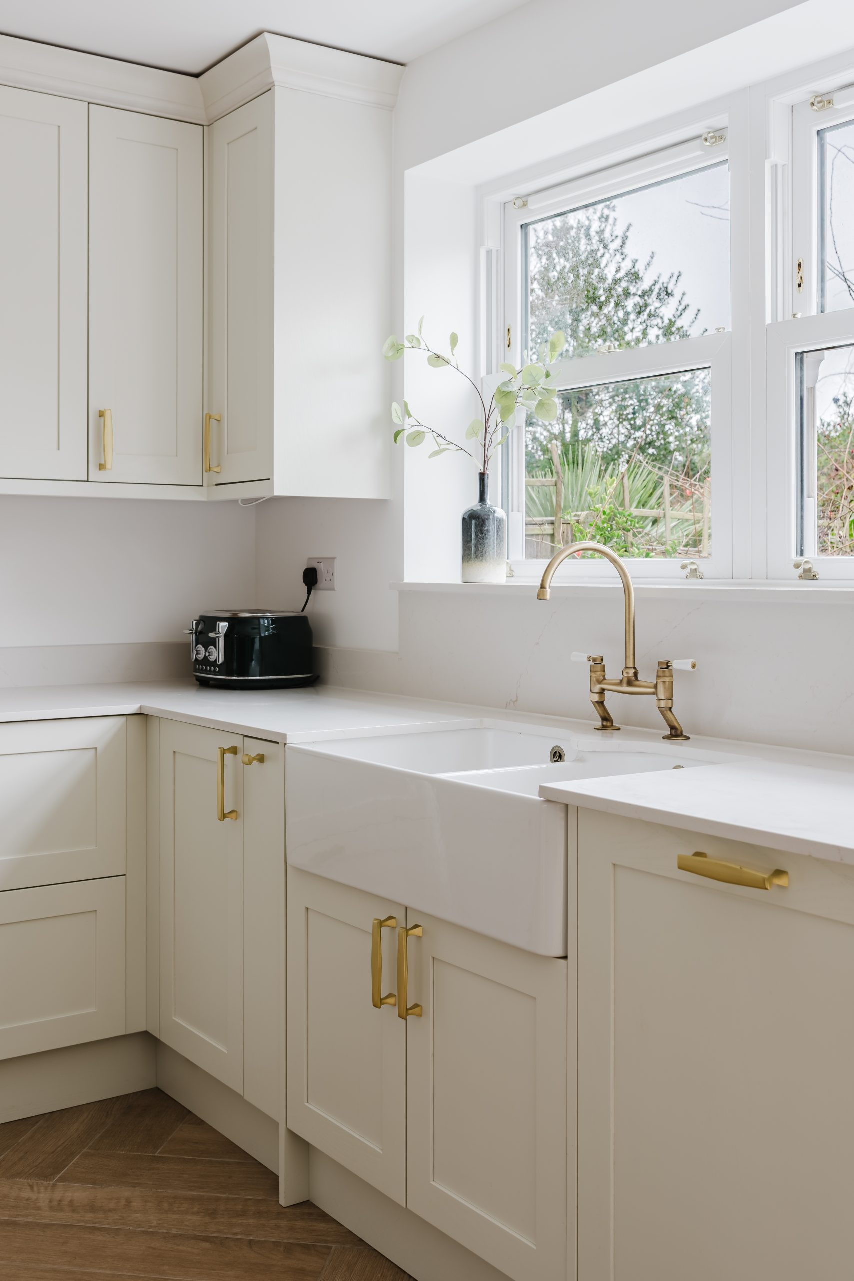 The classic butler sink sits beneath a sunlit window, highlighting the home’s architectural features, while our extra-tall units maximise storage and keep the kitchen bright and open.