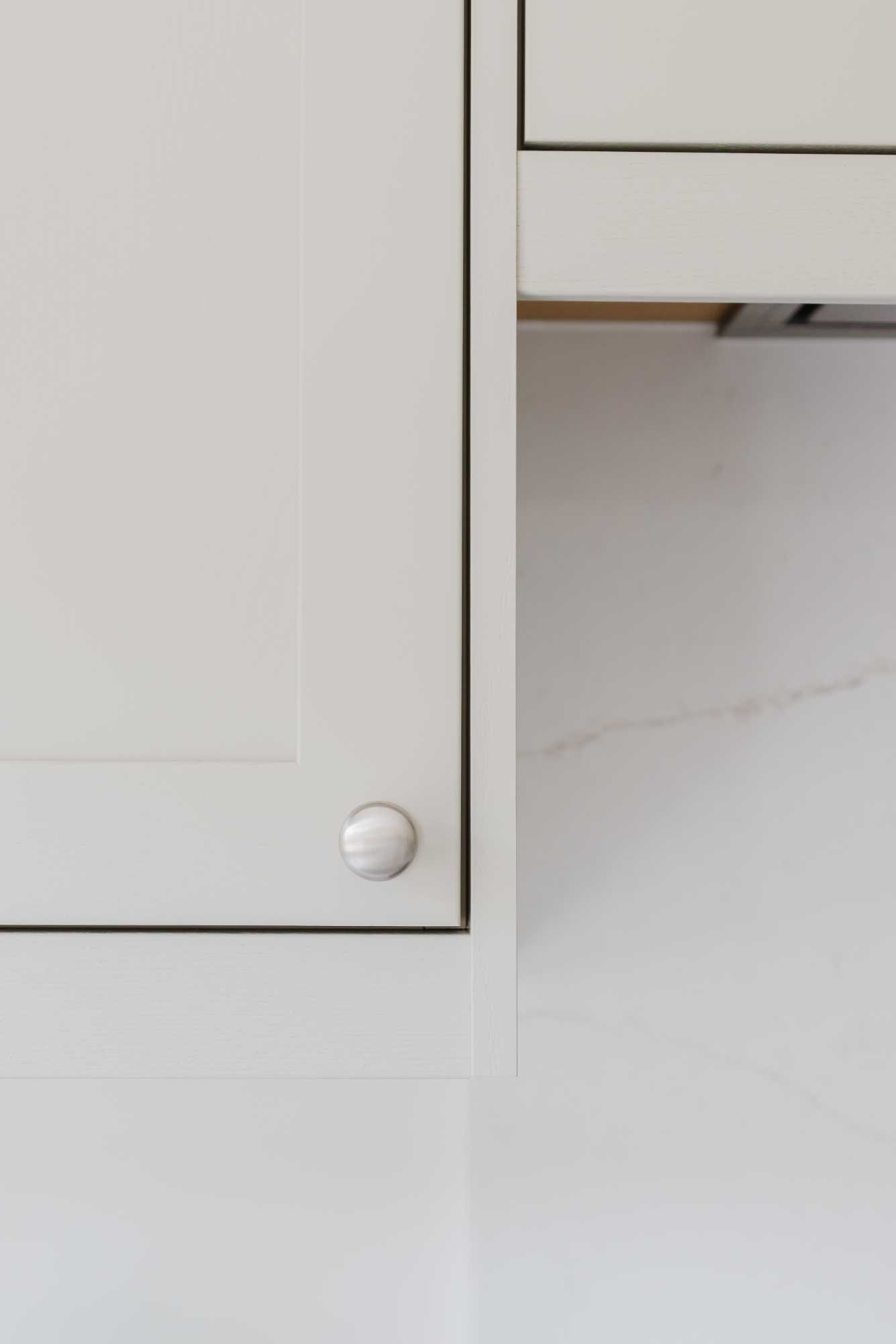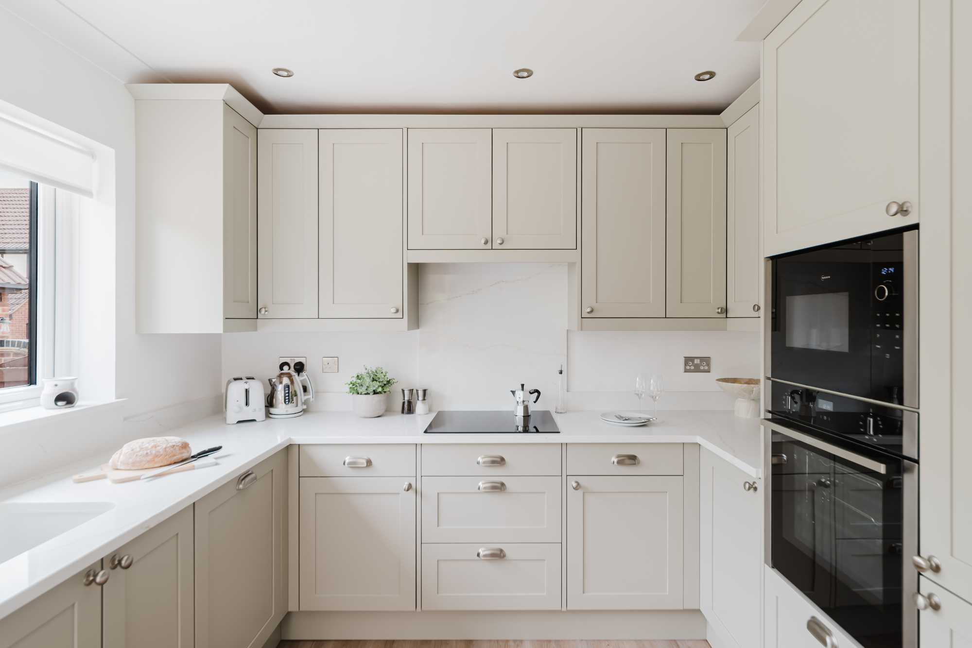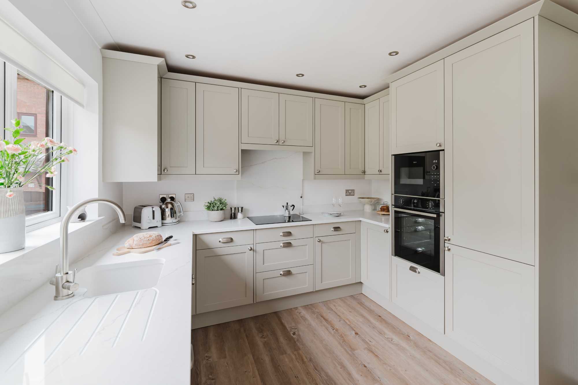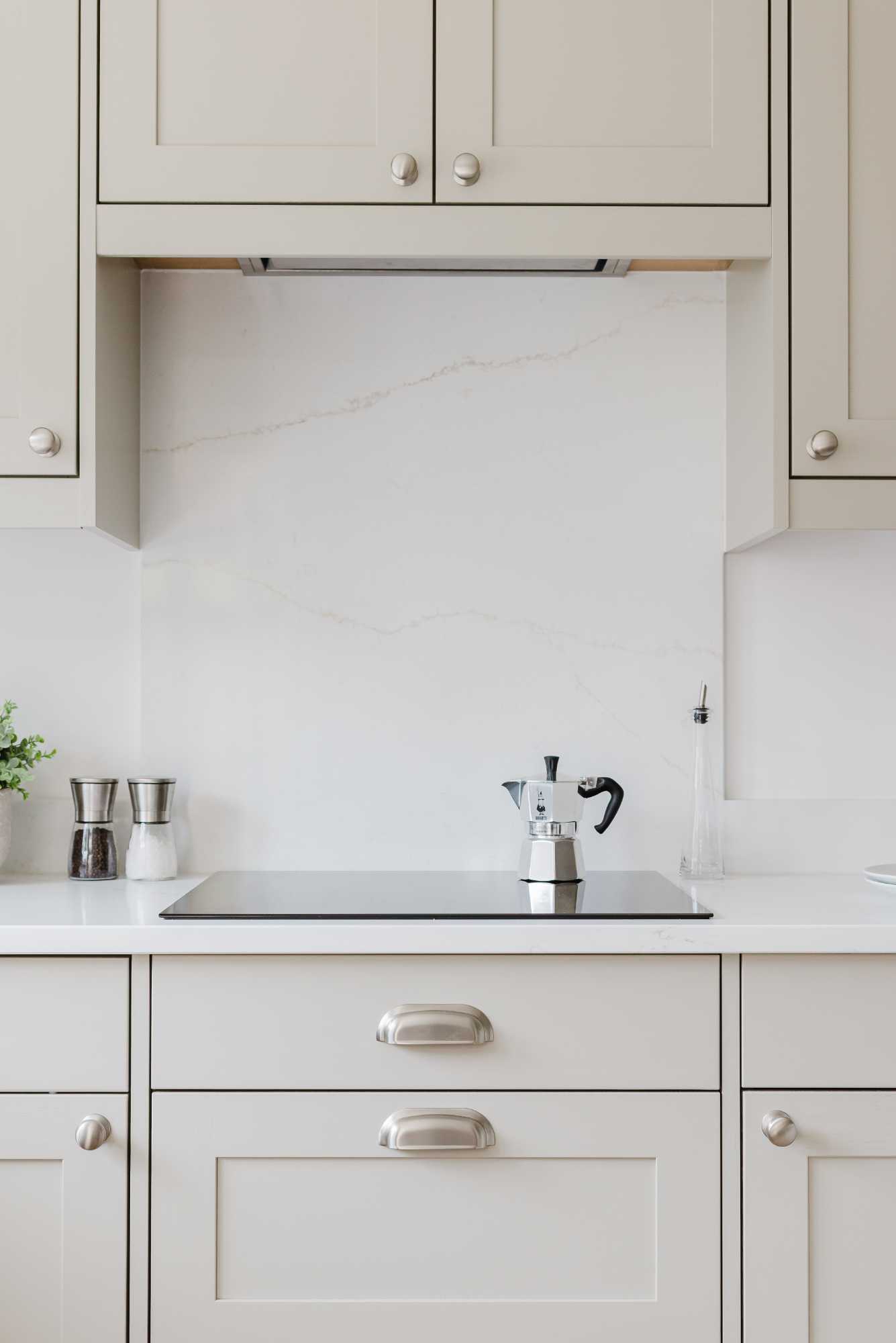 Adrian and Lesley’s kitchen is a calm, contemporary space designed with elegance and everyday practicality in mind. At the heart of the design is the Aldana range – a narrow shaker with a solid ash frame and flat veneer centre panel, finished in a warm, understated Stone tone. This soft neutral pairs effortlessly with the Hampton cup handles and knobs by Hendel and Hendel in a subtle dull nickel finish, bringing a touch of classic charm.