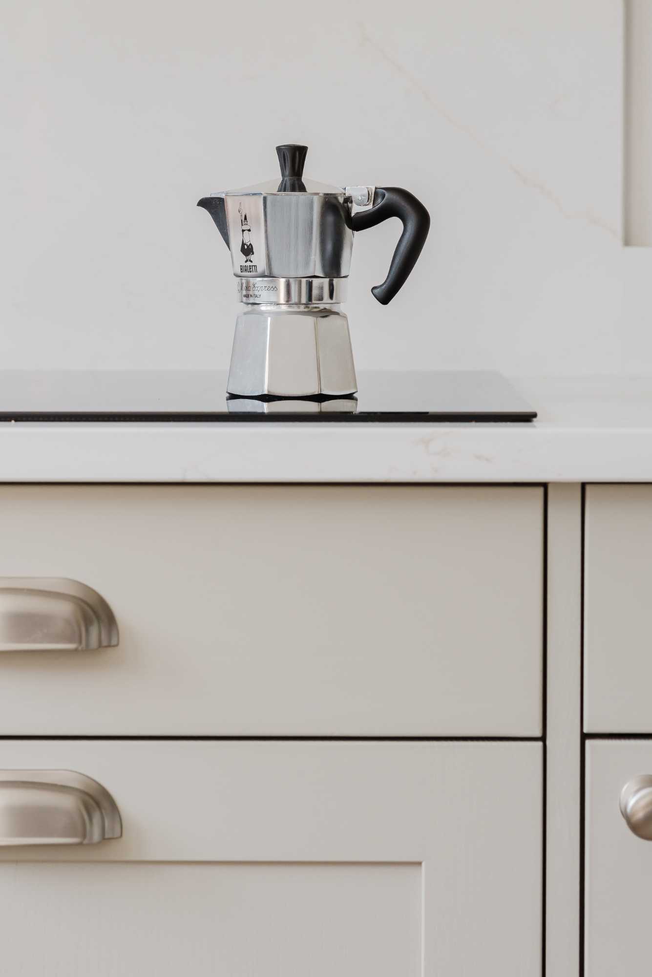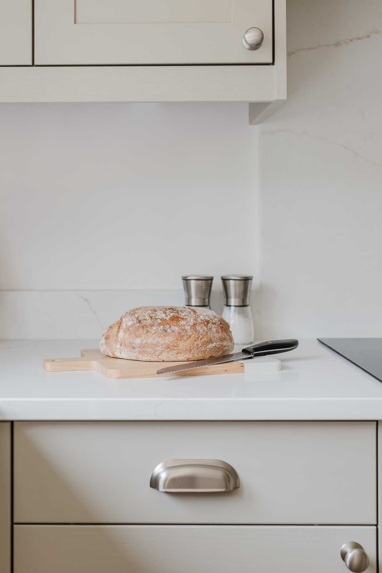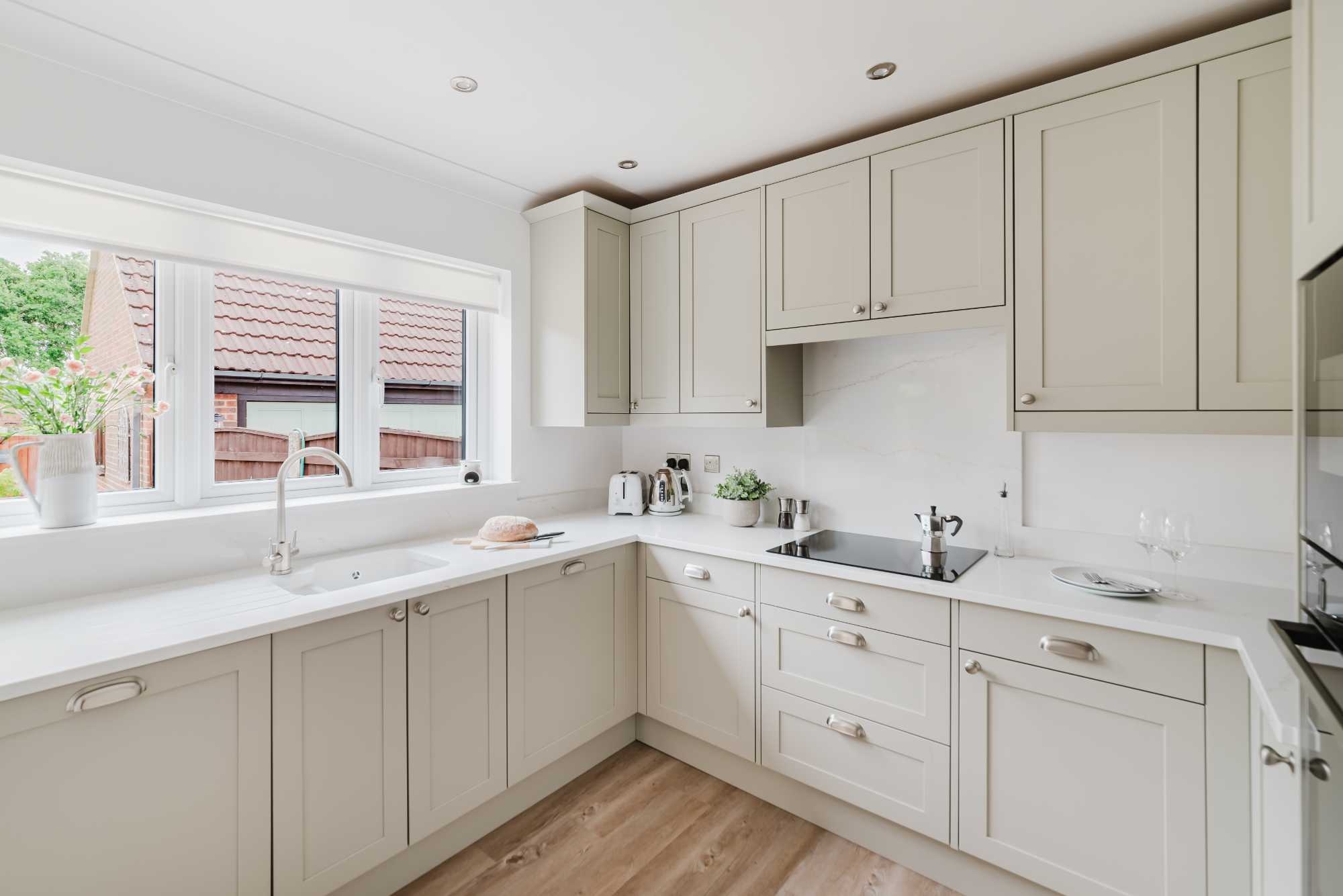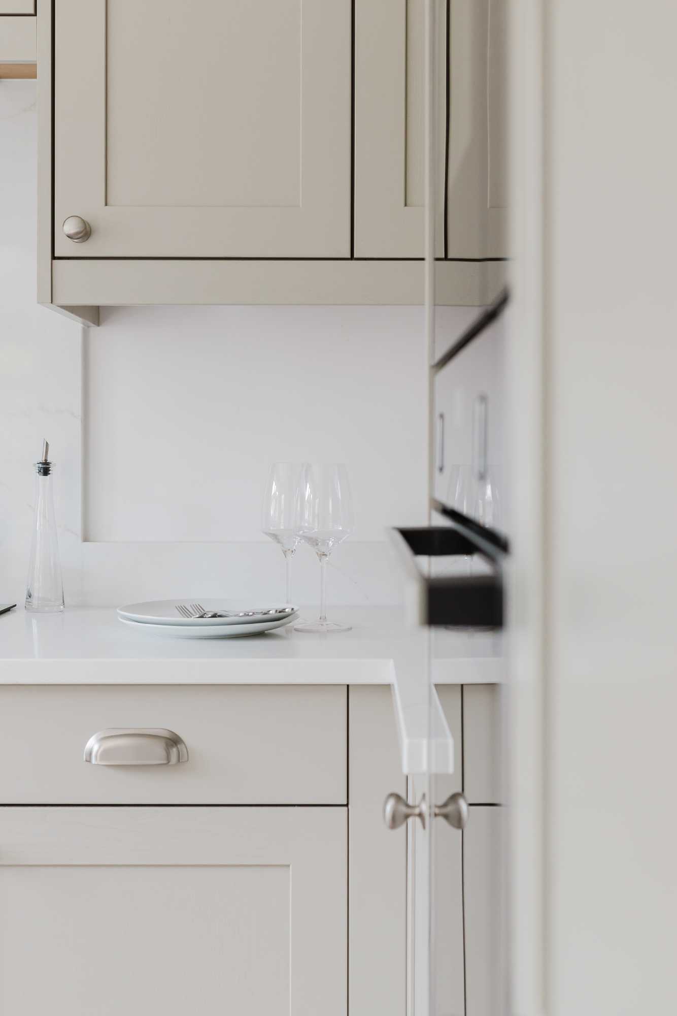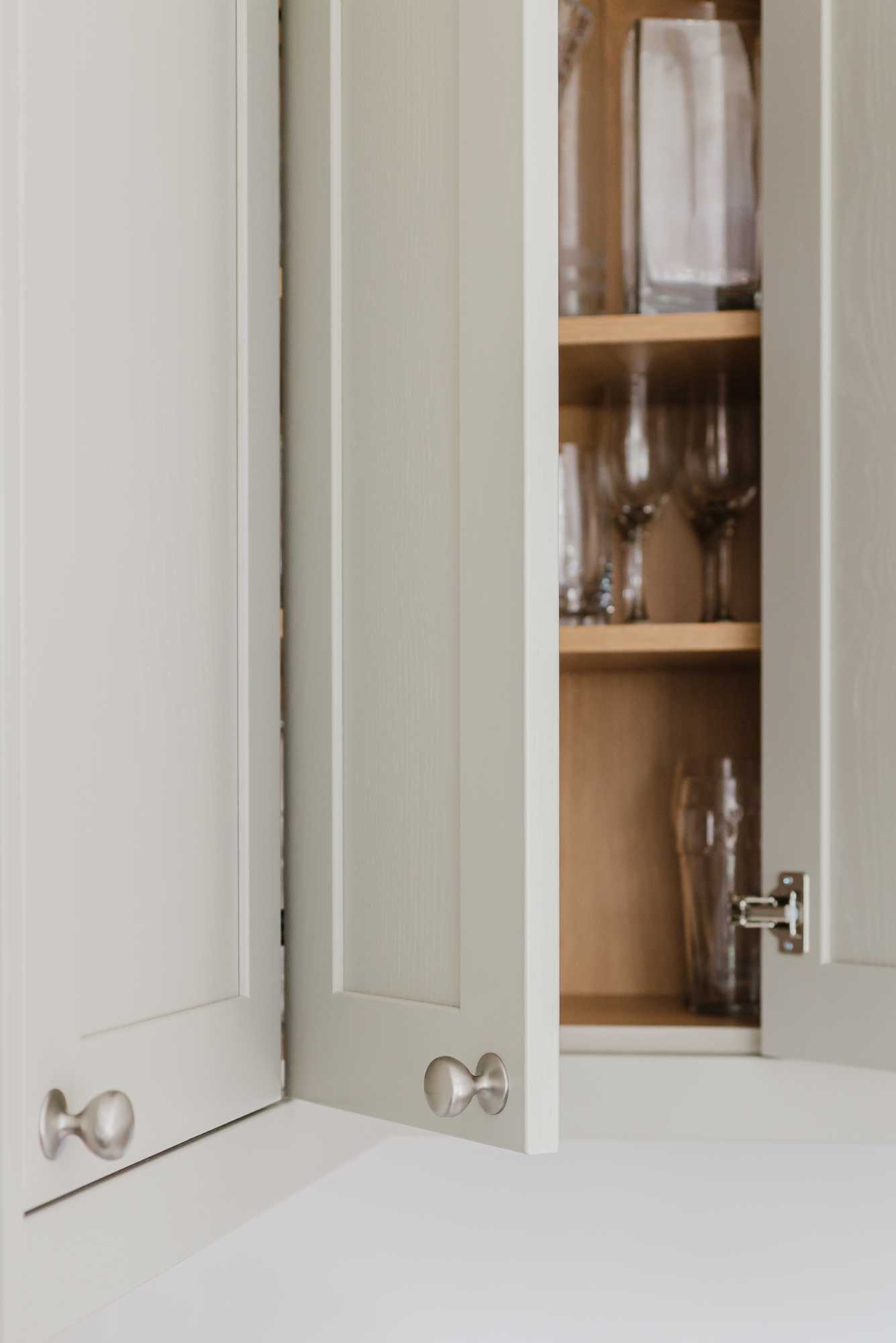 Adrian and Lesley’s kitchen is a calm, contemporary space designed with elegance and everyday practicality in mind. At the heart of the design is the Aldana range – a narrow shaker with a solid ash frame and flat veneer centre panel, finished in a warm, understated Stone tone. This soft neutral pairs effortlessly with the Hampton cup handles and knobs by Hendel and Hendel in a subtle dull nickel finish, bringing a touch of classic charm.