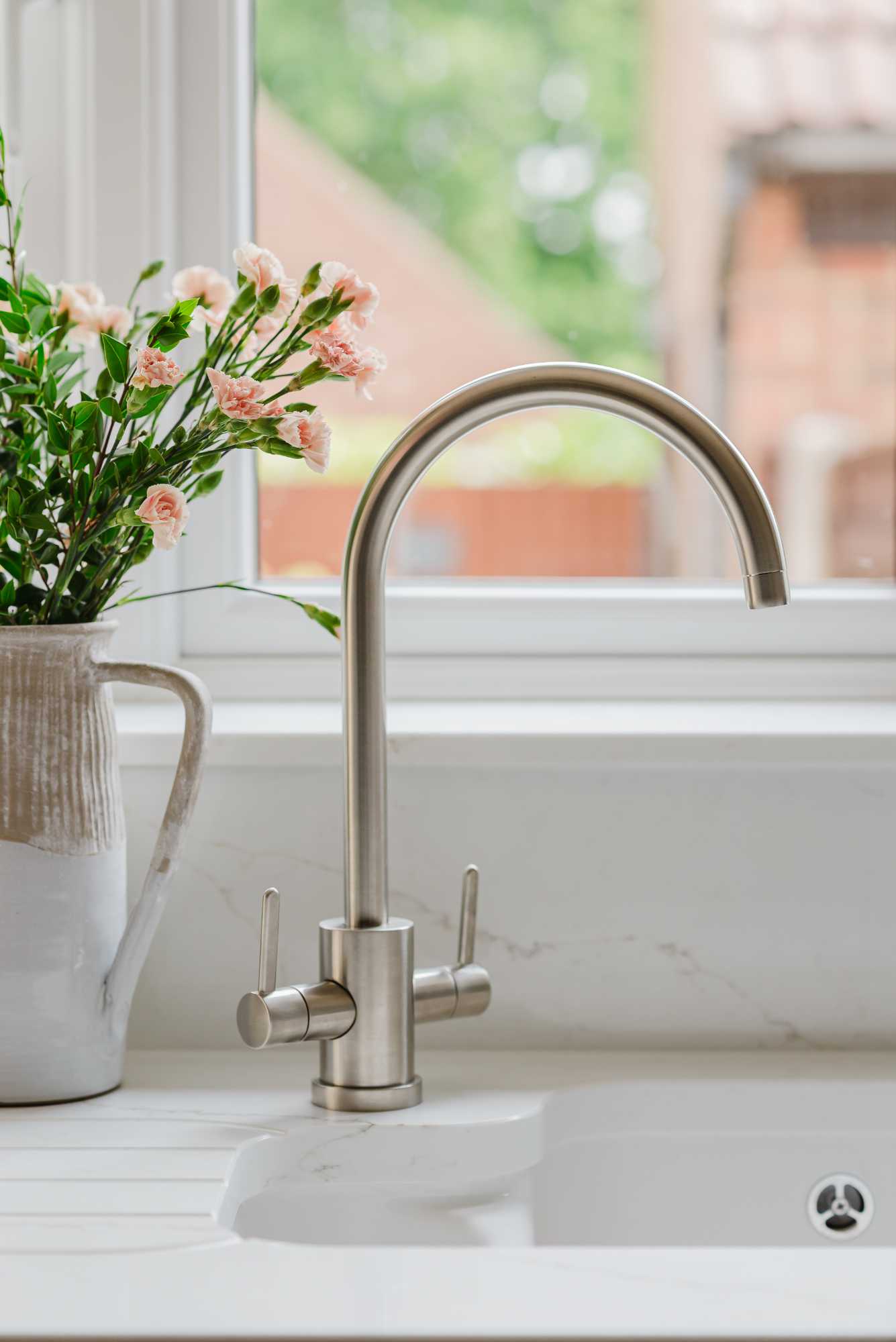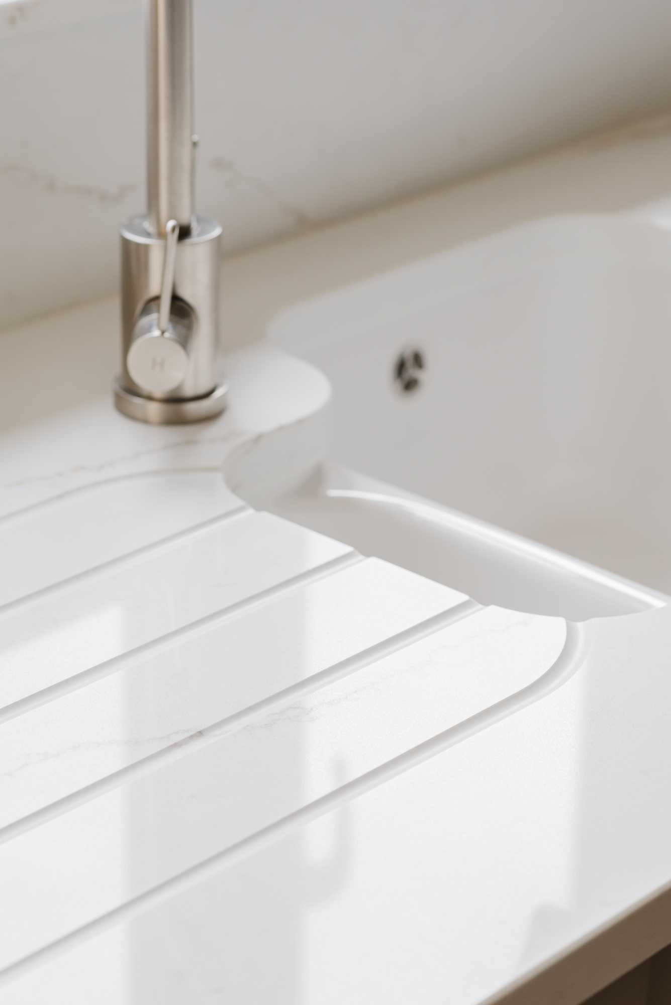 The worktops are crafted from 30mm Artscut Golden Venato quartz, offering a light, luxurious surface with delicate veining that lifts the room’s palette. A Villeroy & Boch Cisterna 60B inset ceramic sink in White Ceramicplus anchors the kitchen with clean, timeless lines, while the Franke Krios J tap in SilkSteel adds a sleek, modern edge.