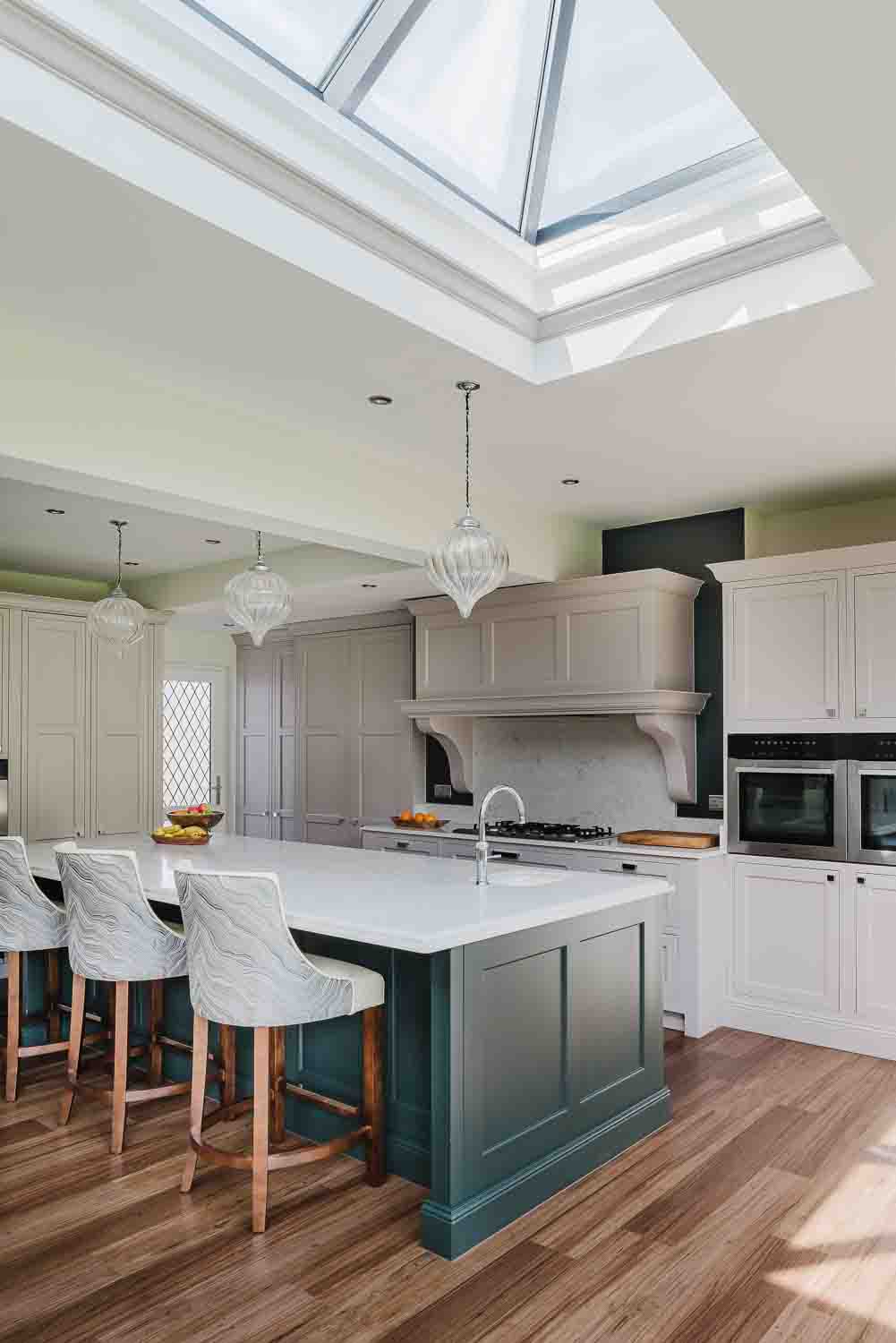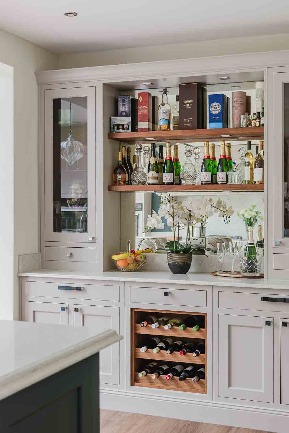 The layout is thoughtfully designed, featuring dovetail oak internal drawers and a Villeroy & Boch undermount ceramic sink set across from the bar area featuring an antique silver mirror splashback – a feature that brings both depth and vintage charm. The moulded skirted plinth and classic mantle complete the look with subtle architectural detail.