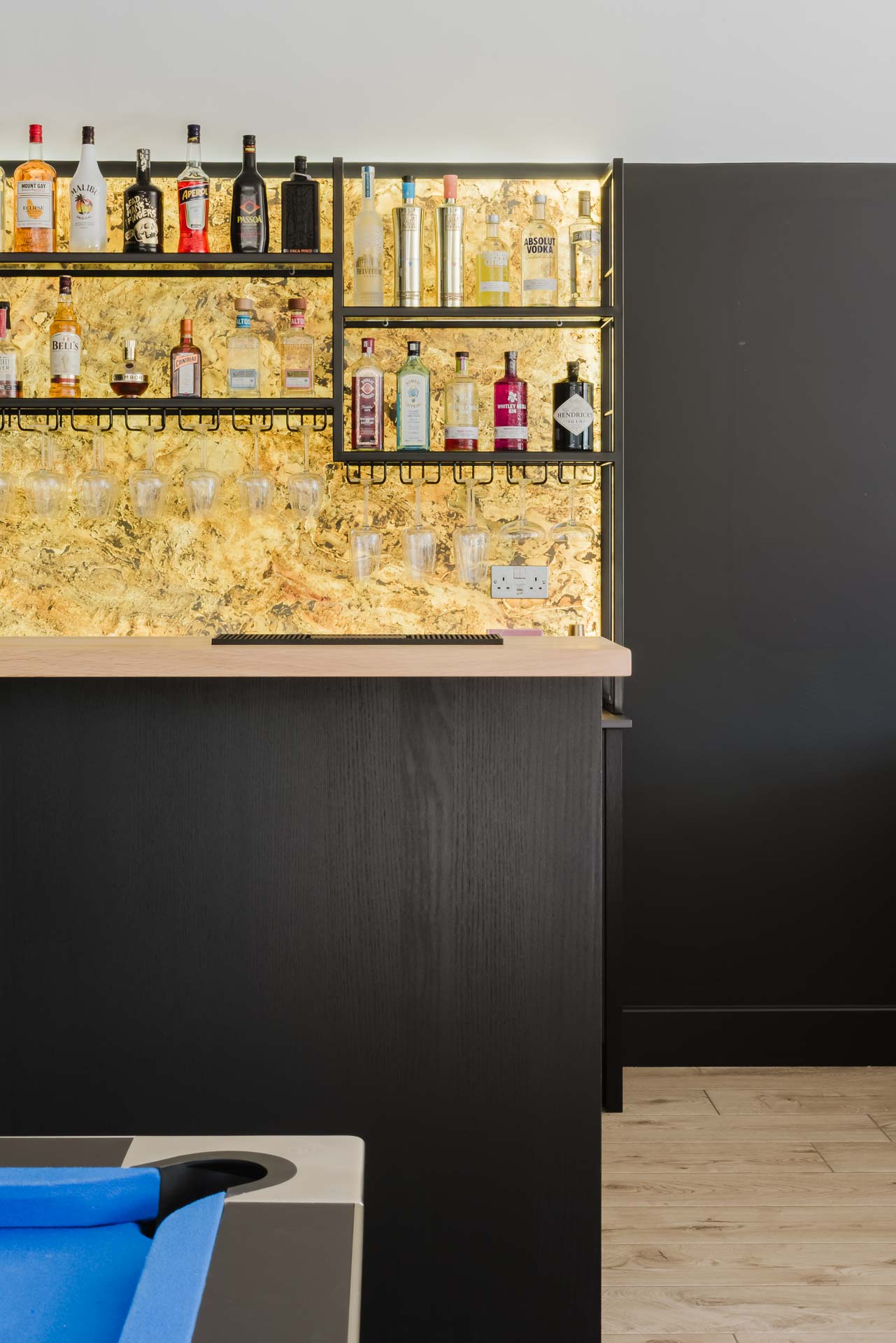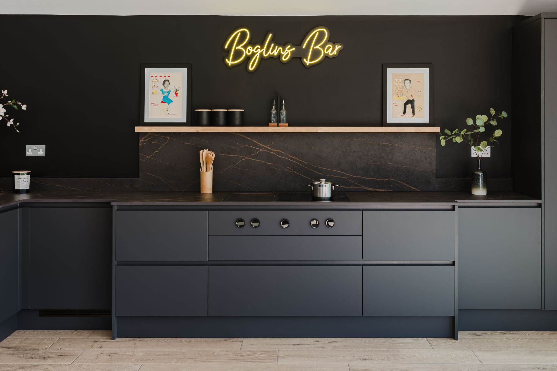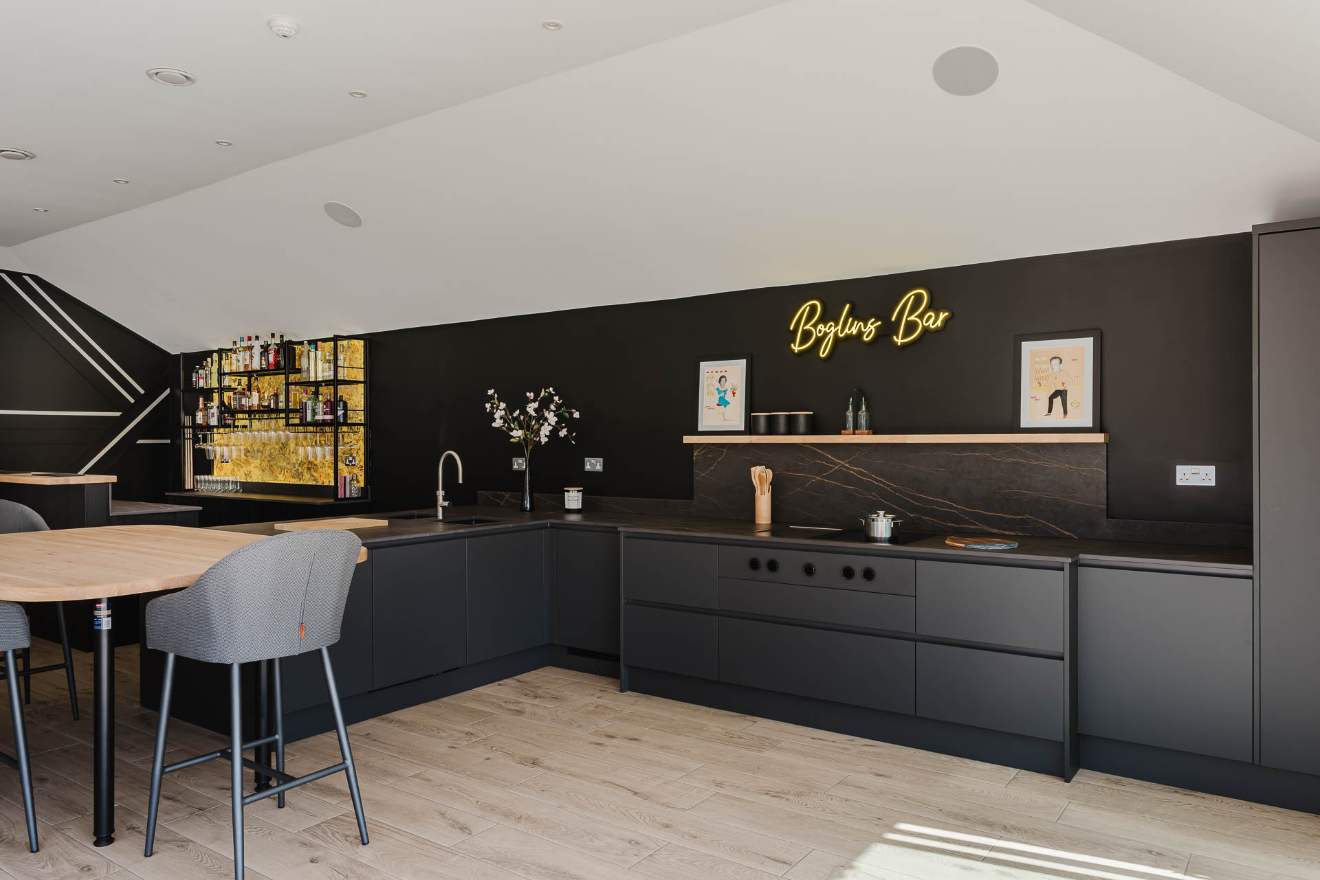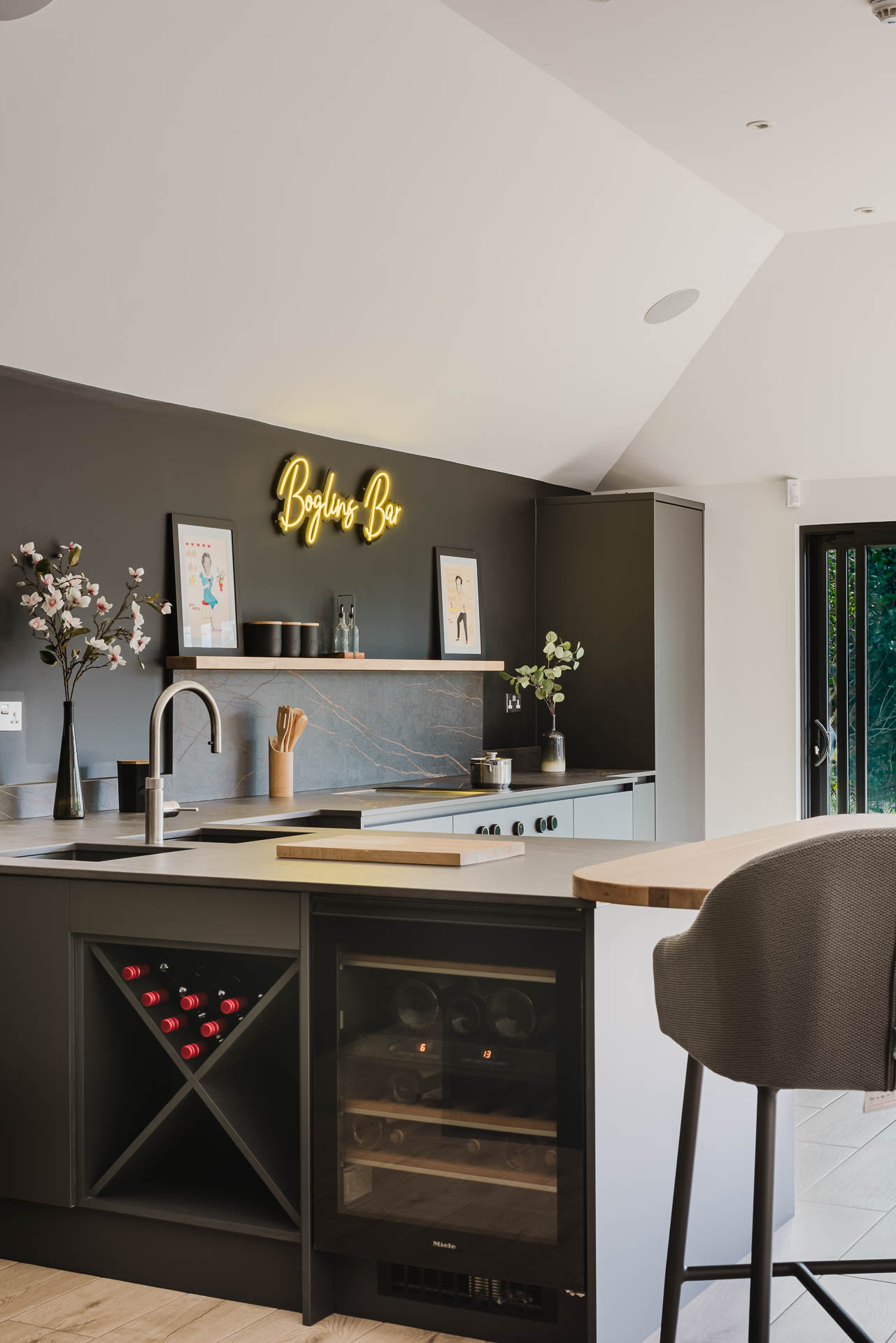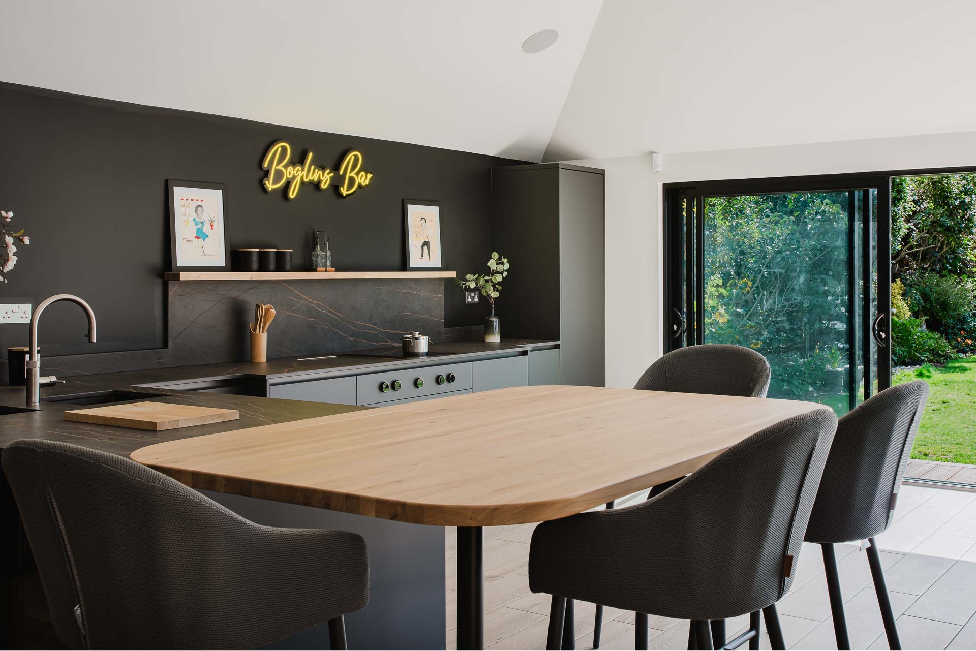 A solid wood breakfast bar introduces natural texture and contrast, softening the bold graphite cabinetry and offering a welcoming spot for casual dining or conversation. The design is elevated further by a Quooker tap in stainless steel, bringing instant hot water with cutting-edge functionality, perfectly in keeping with the streamlined aesthetic.
