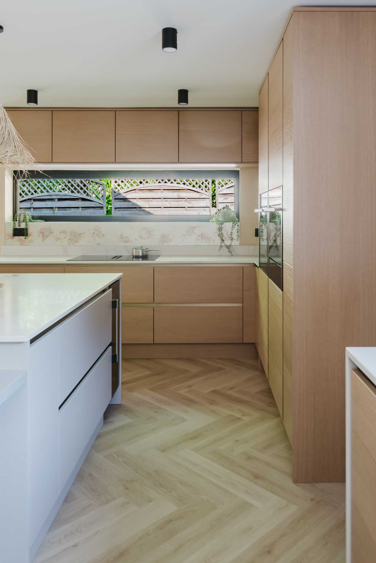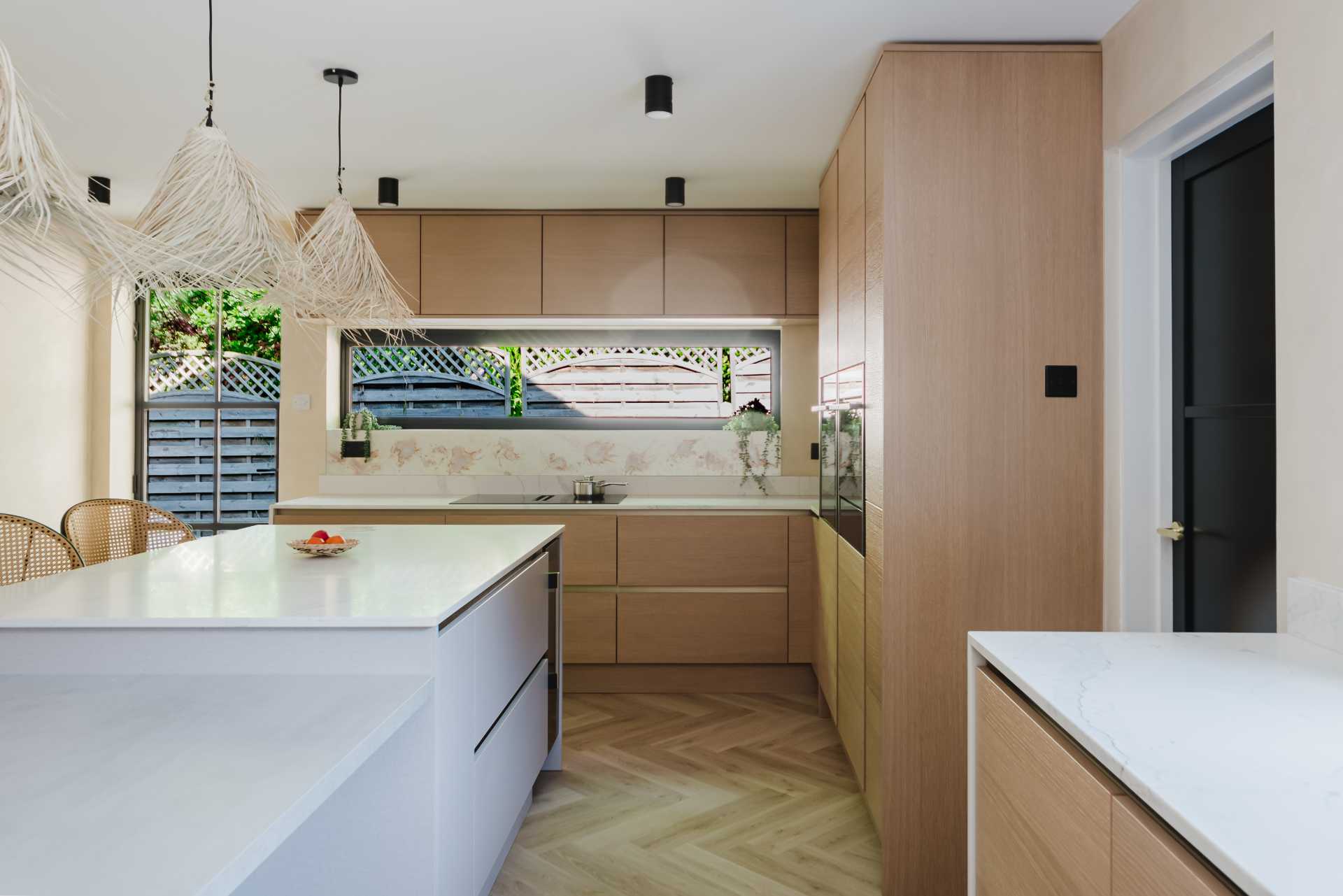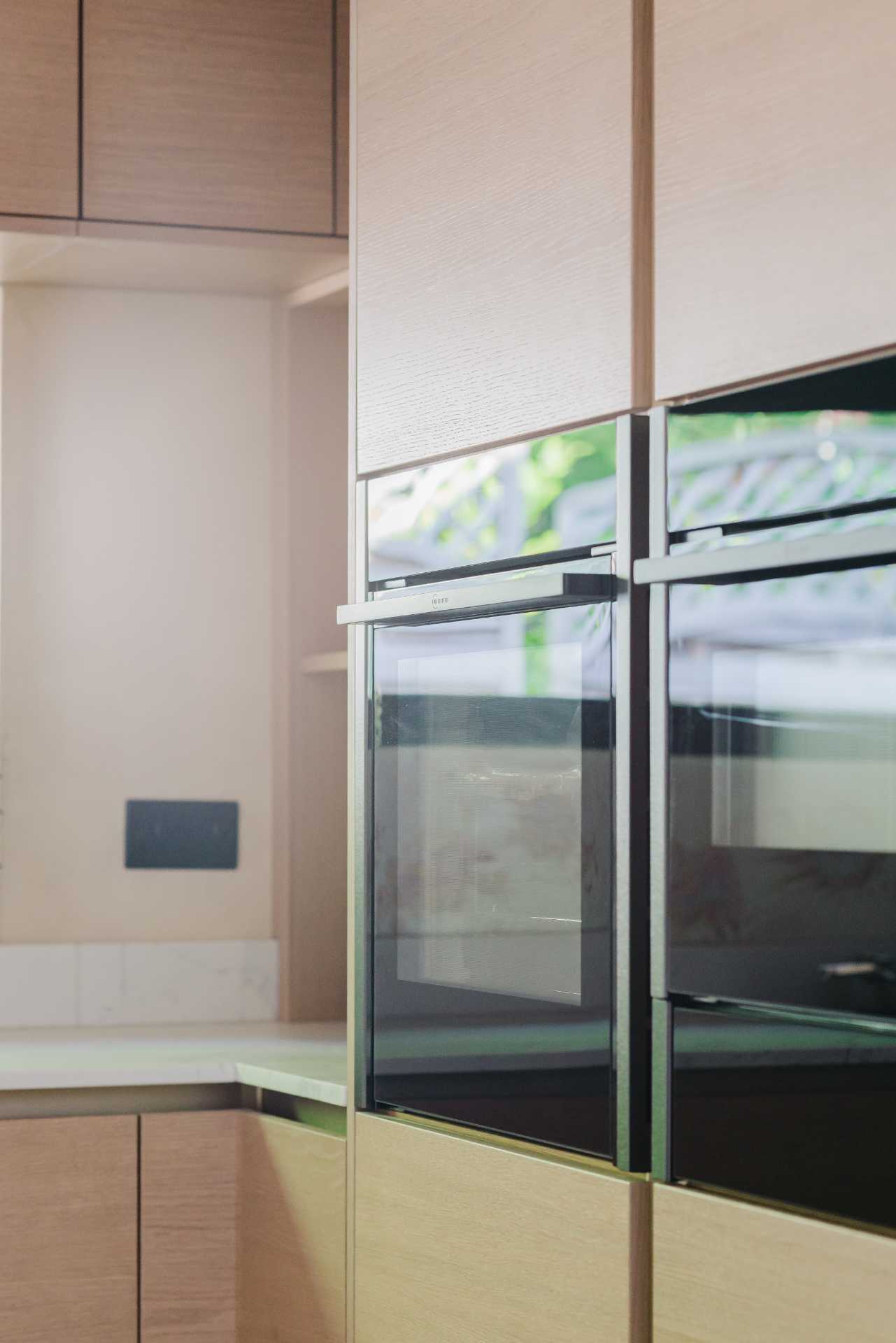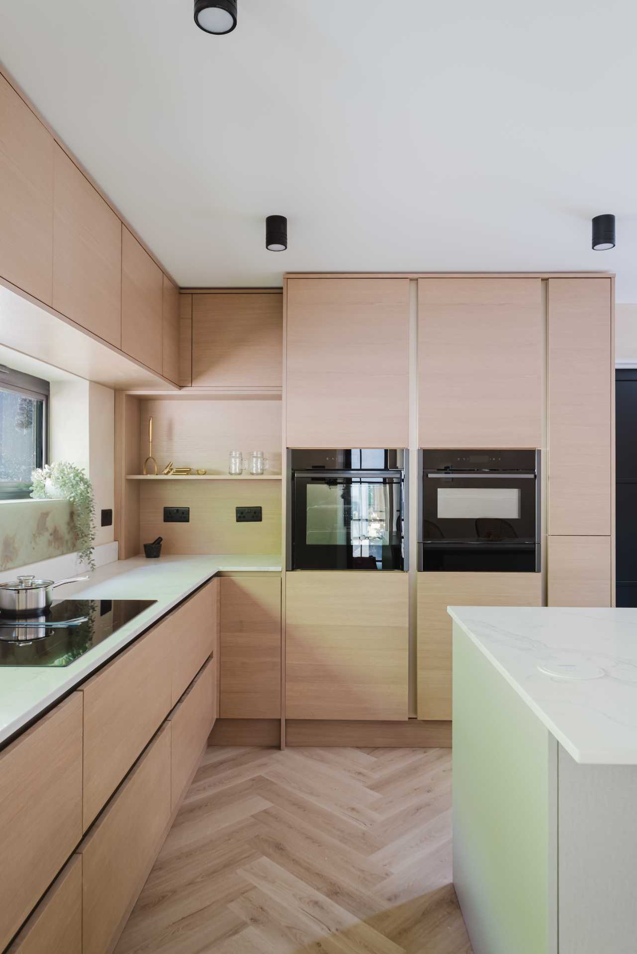A 20mm Calacatta Gold quartz worktop by Nile introduces classic elegance, while the glass splashback reflects light gently across the room. Neff appliances – including the N70 pyrolytic oven, venting hob, built-in combi microwave and undercounter wine cabinet – are chosen for both function and form, with black and graphite-grey finishes that feel timeless yet contemporary.