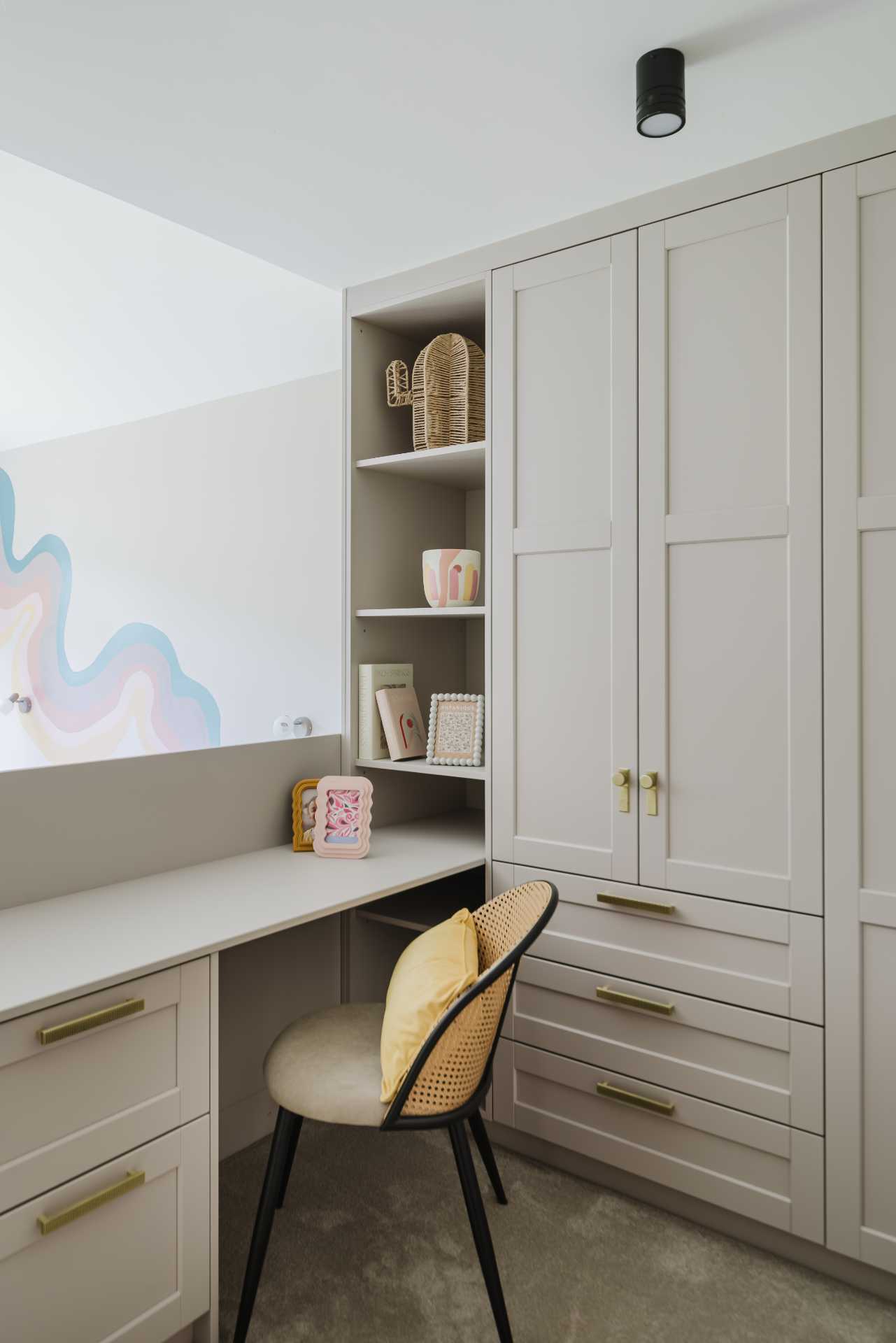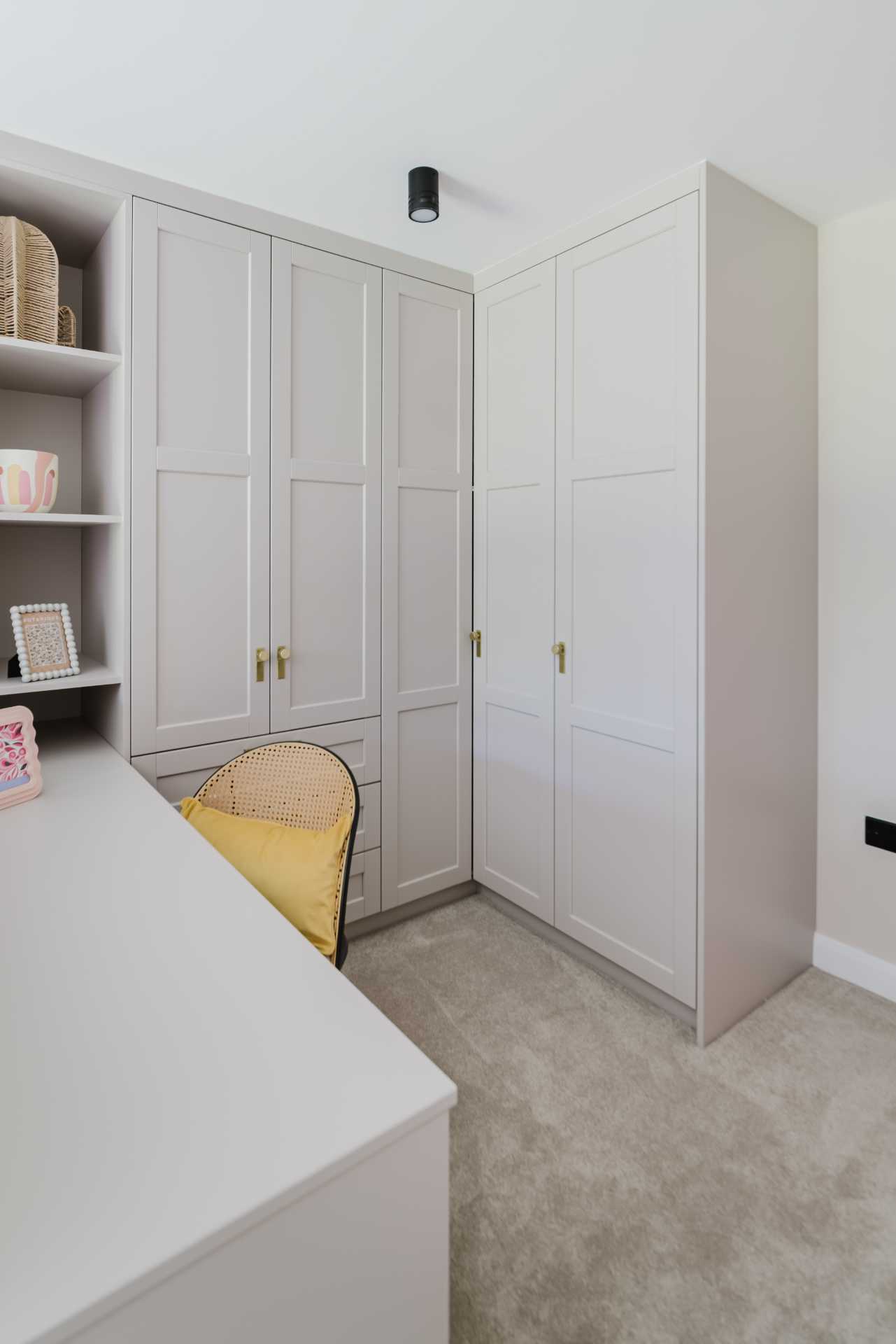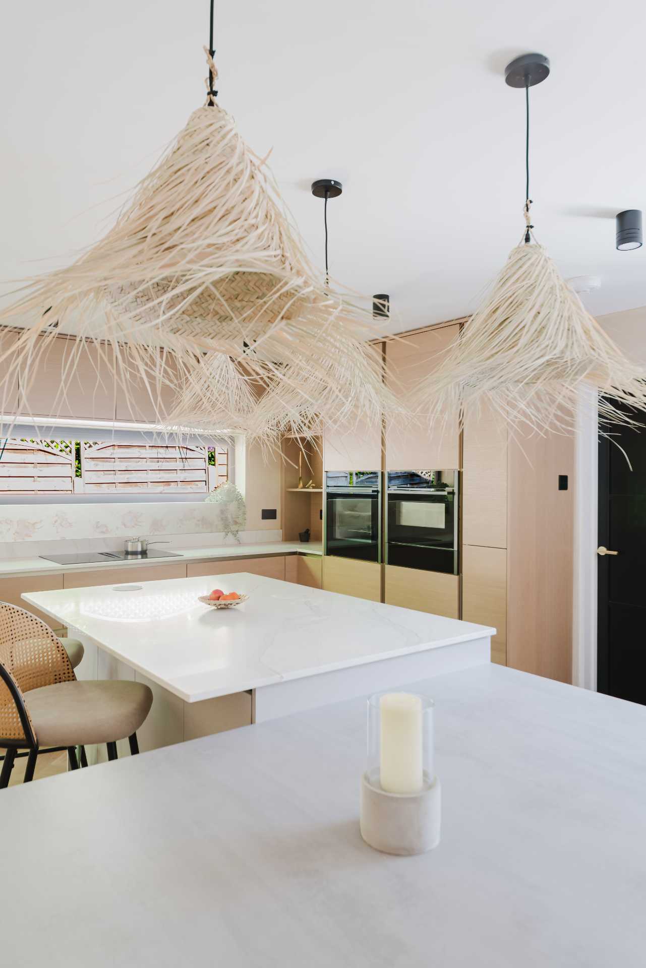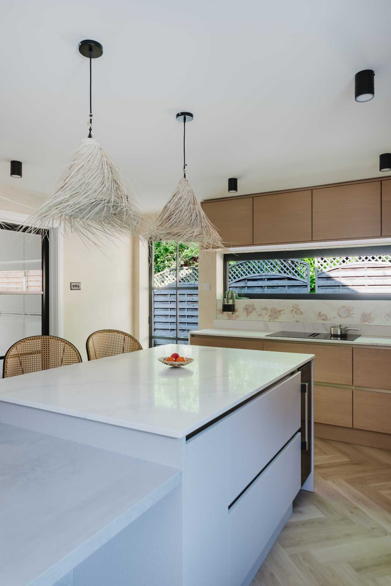 A 20mm Calacatta Gold quartz worktop by Nile introduces classic elegance, while the glass splashback reflects light gently across the room. Neff appliances – including the N70 pyrolytic oven, venting hob, built-in combi microwave and undercounter wine cabinet – are chosen for both function and form, with black and graphite-grey finishes that feel timeless yet contemporary.