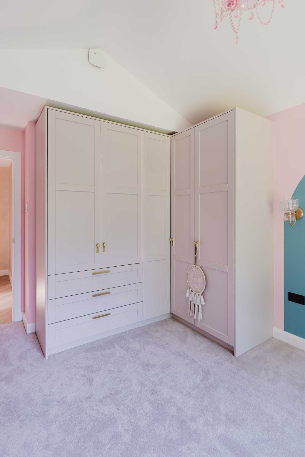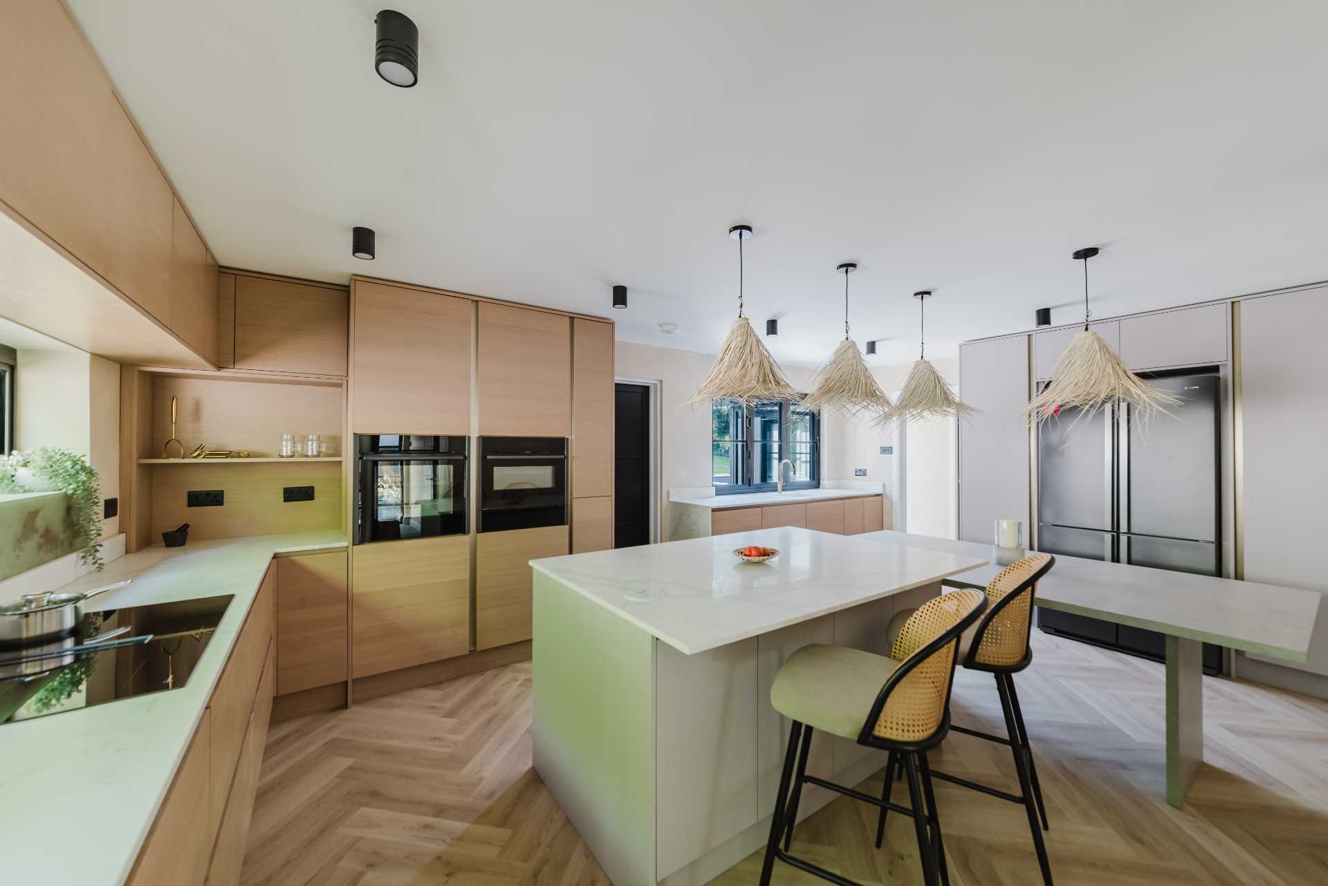 The kitchen also features smart storage details like a 300mm pull-out larder and open wine rack, ensuring practicality matches the visual appeal. The Caple ceramic and undermount sinks in crisp white, paired with gold-finished taps from Caple and Quooker, add subtle luxury. A statement American-style fridge freezer in gunmetal anchors the space, rounding off a kitchen that feels calm, refined, and effortlessly functional.