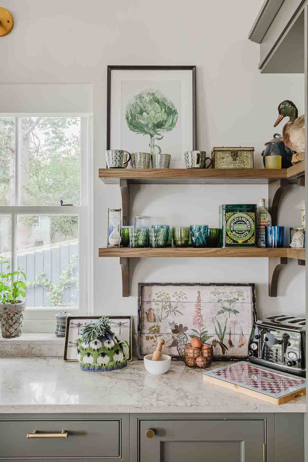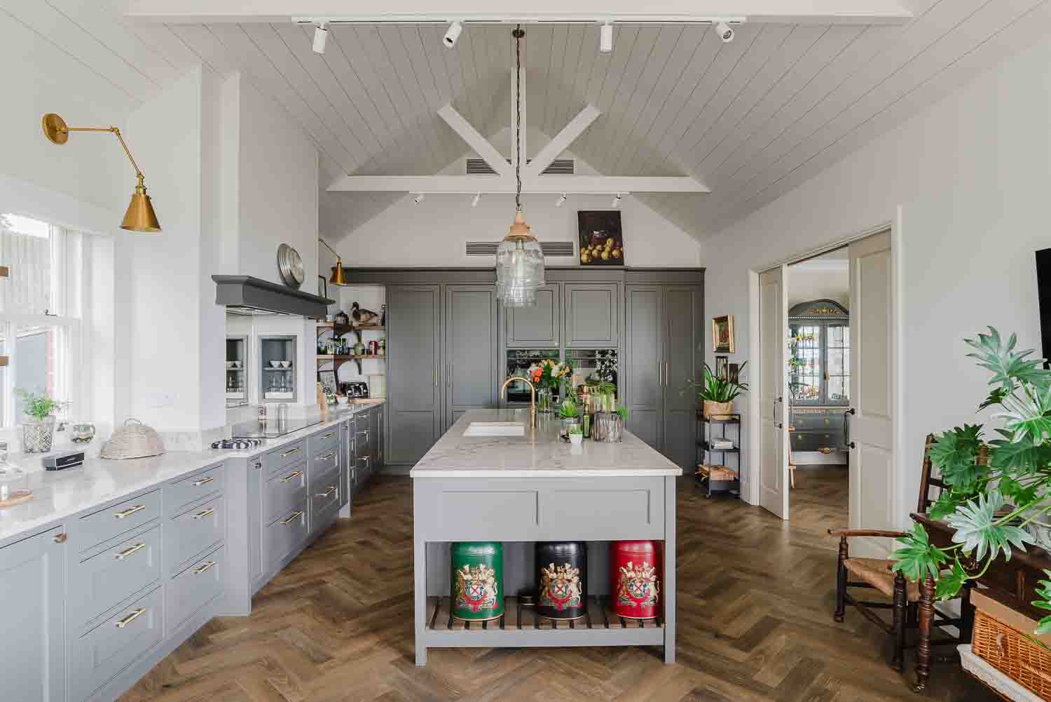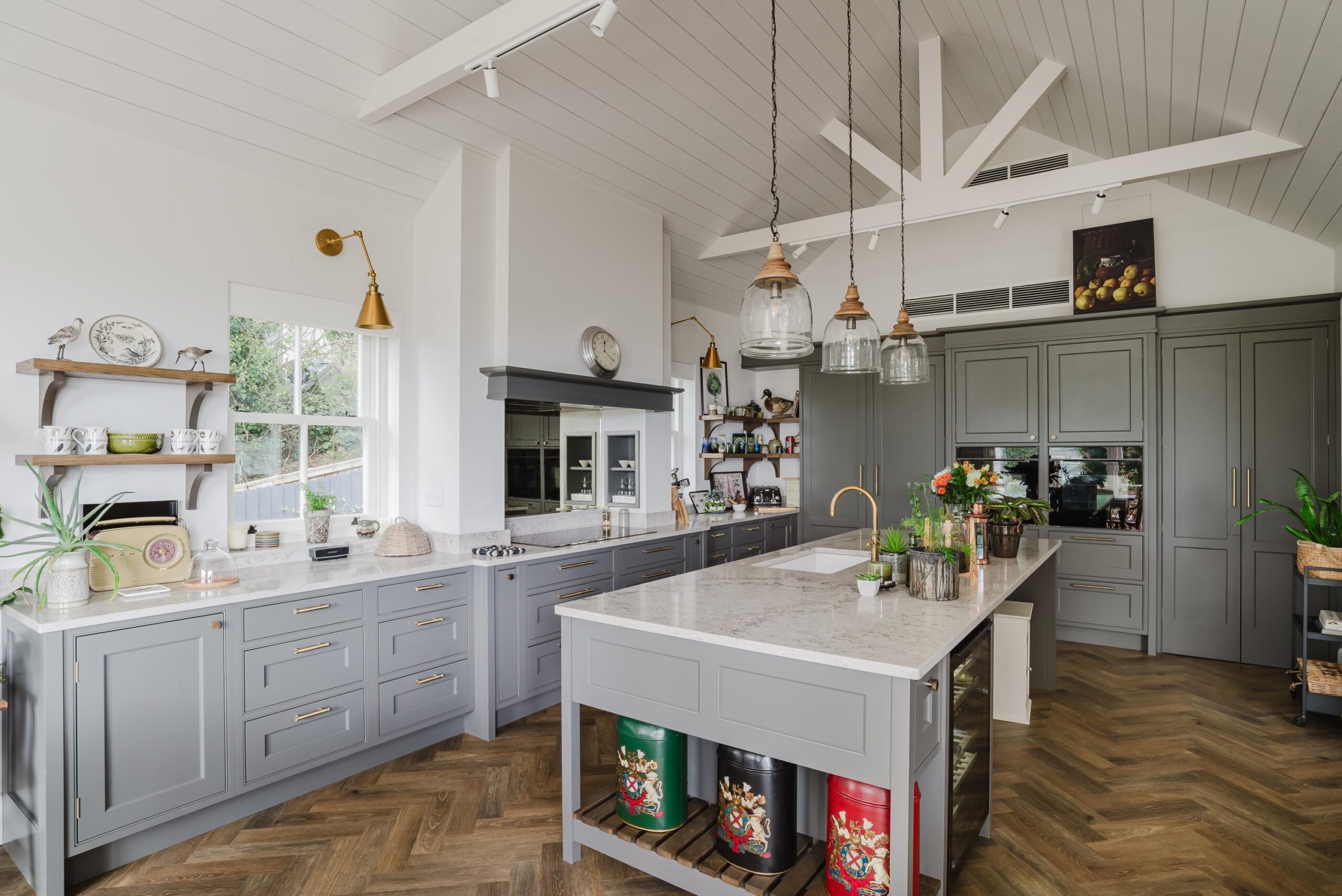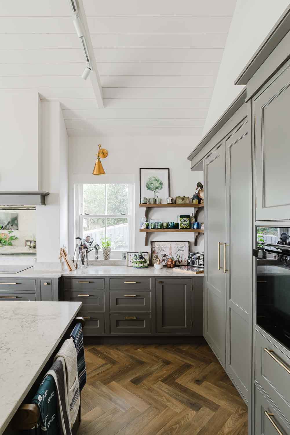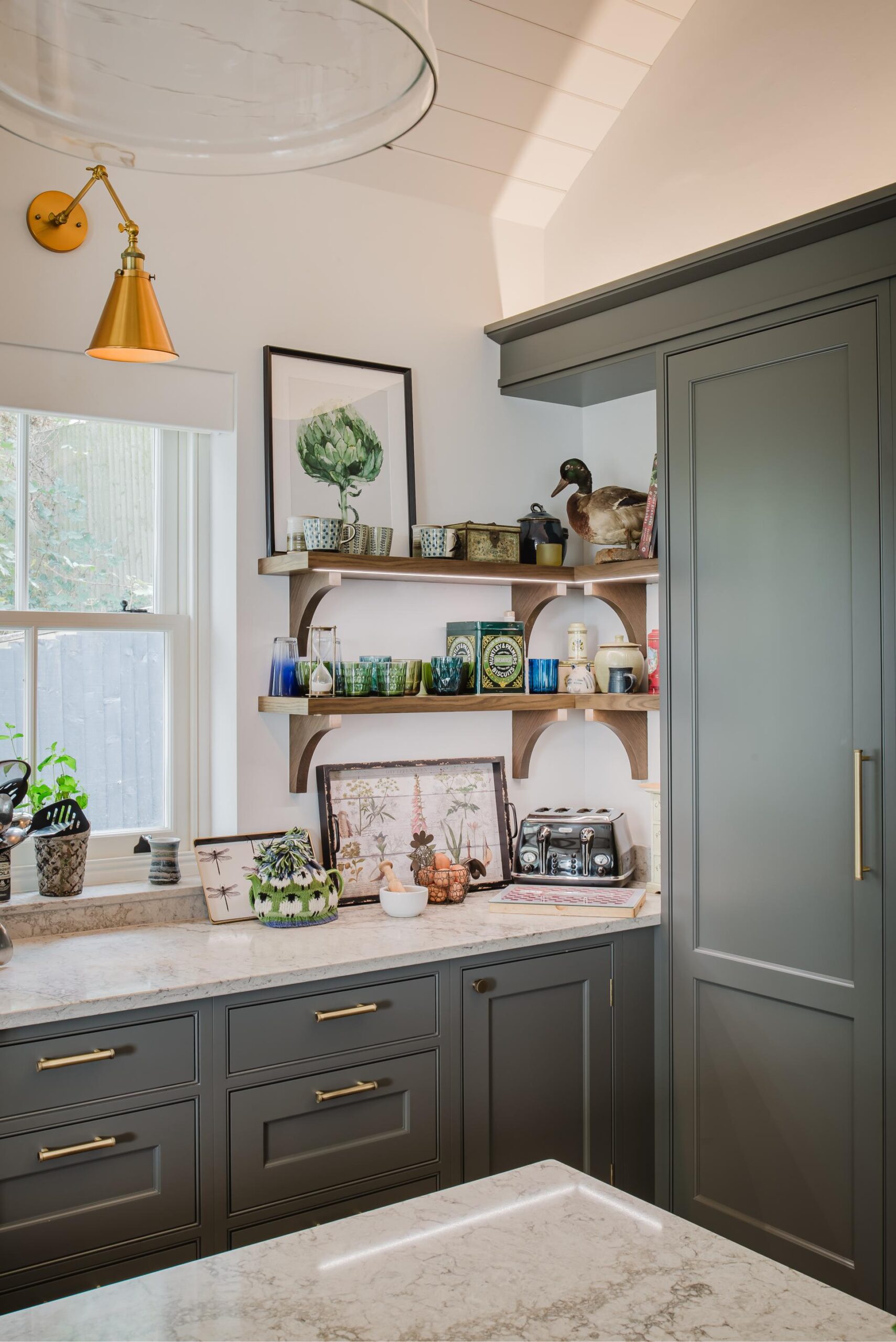 Malcolm and Elena’s kitchen is a beautifully tailored space, designed with a bespoke smooth in-frame style featuring elegant internal beading and finished in a unique soft tone, RAL NCSA 6502-Y. Antique brass Wenlock knobs and handles, along with matching exposed hinges, bring warmth and character to the cabinetry.