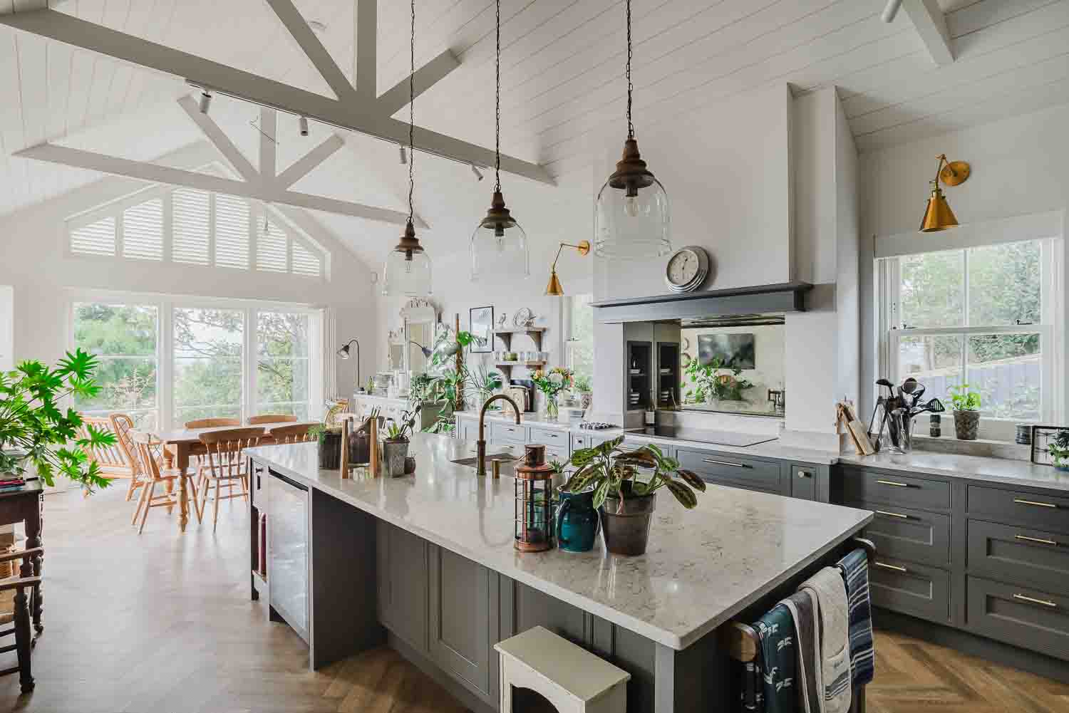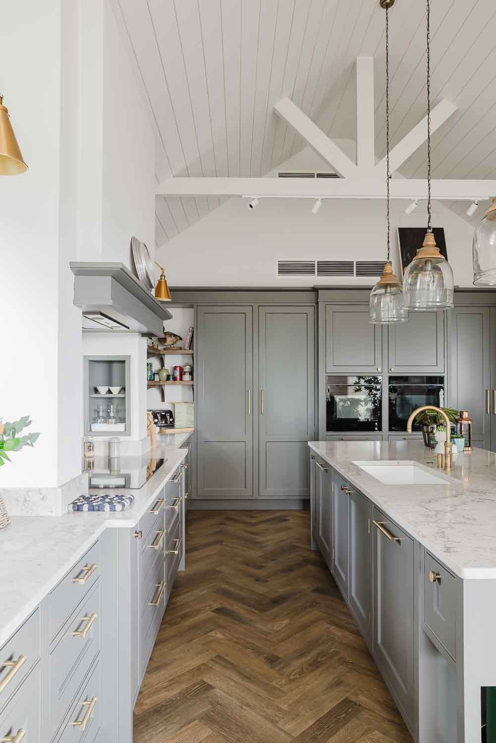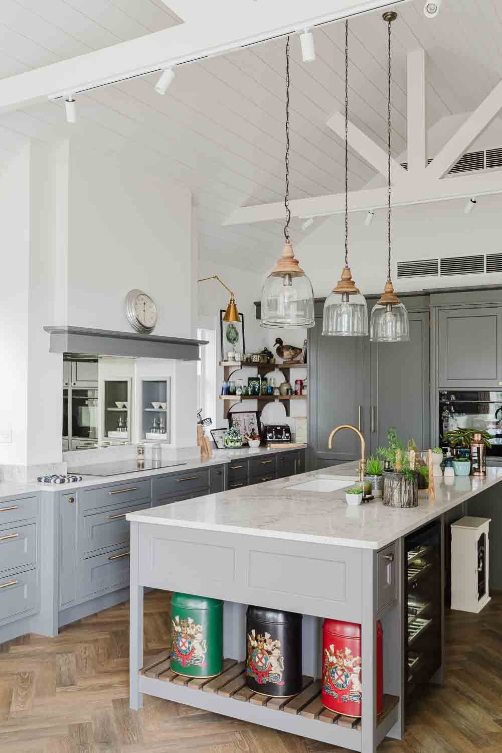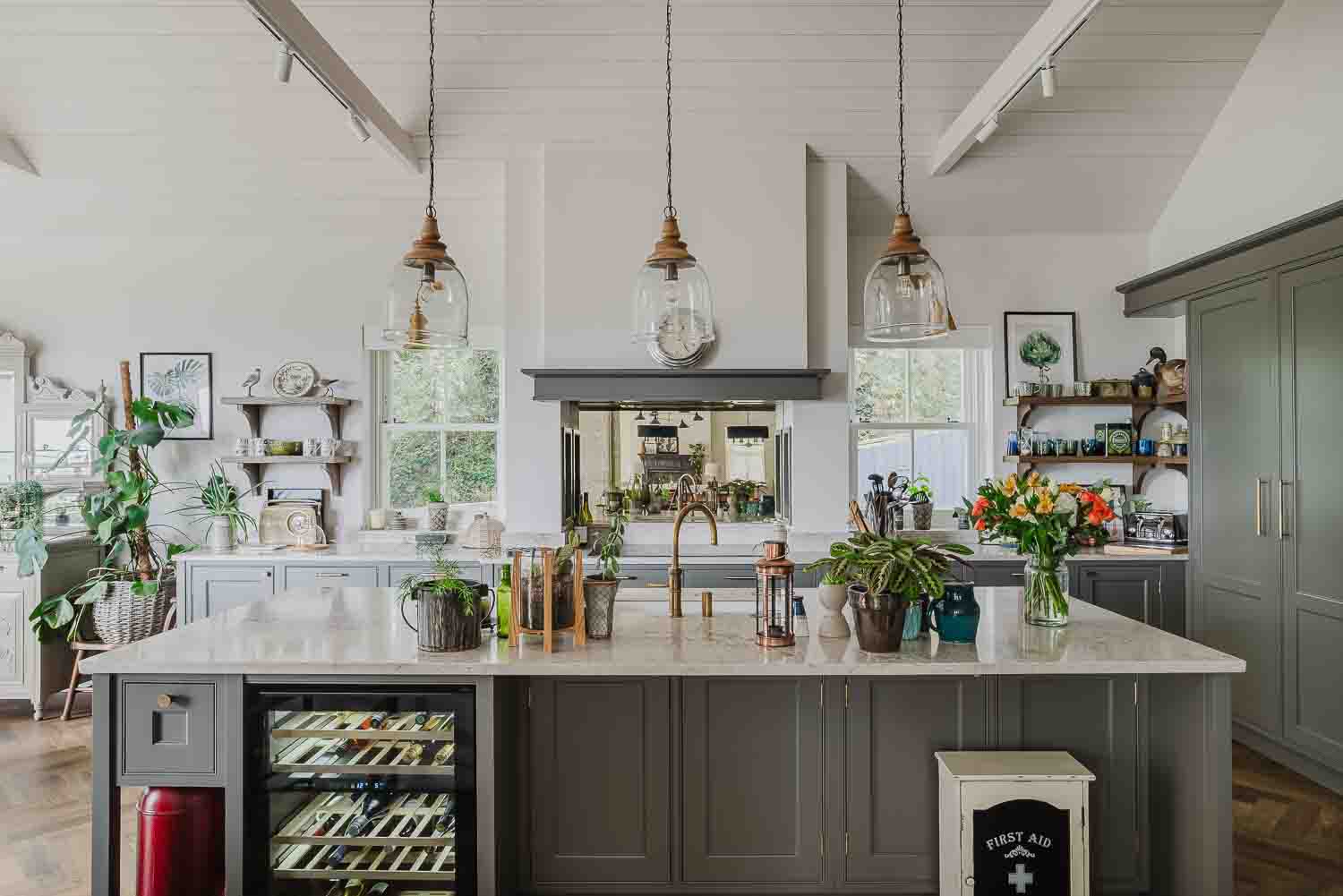 A Shaws of Darwen ceramic sink pairs seamlessly with a Patinated Brass Quooker Pro3 Classic Fusion Round tap and sits opposite a made-to-measure antique mirror silver glass splashback that adds light and depth to the space.