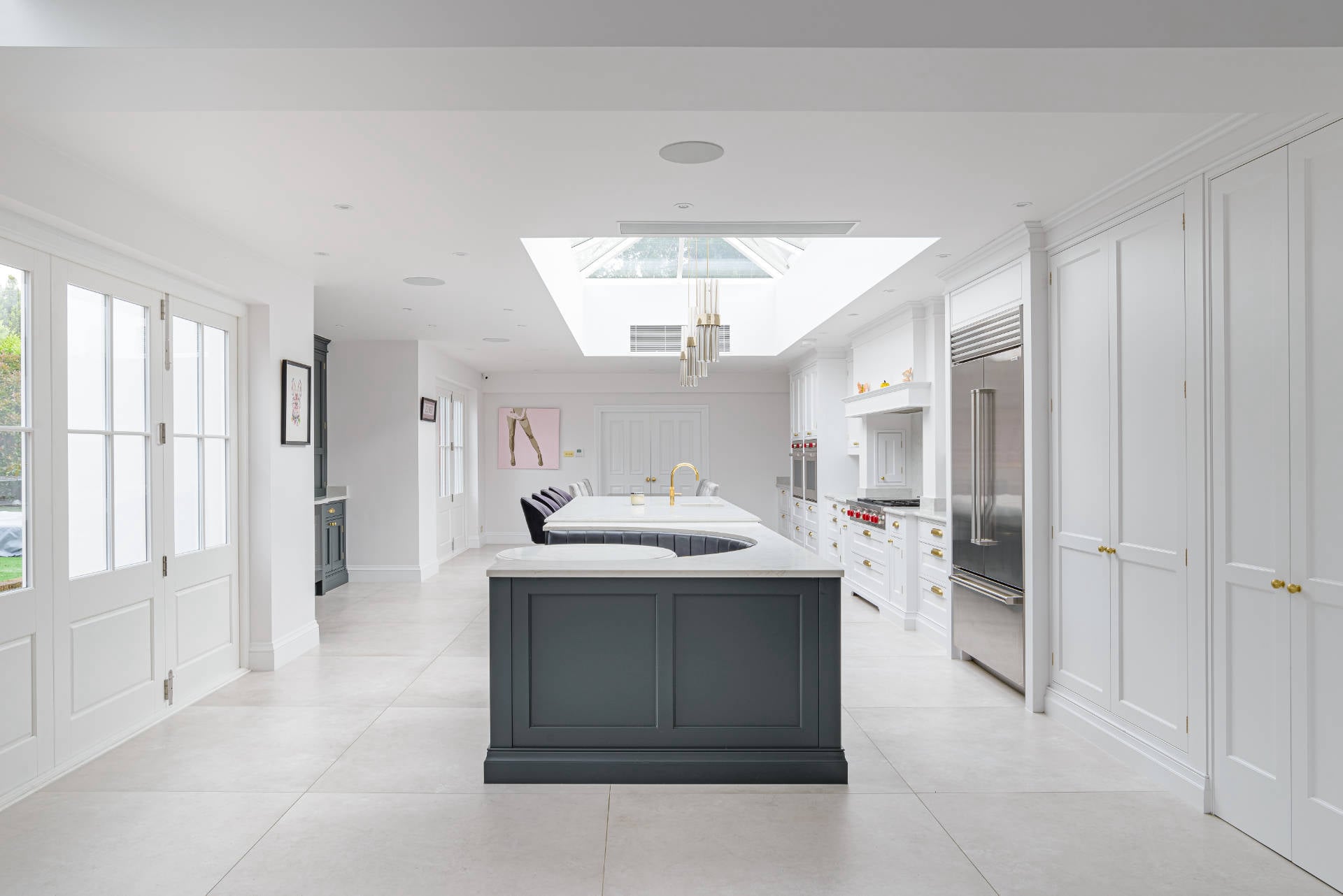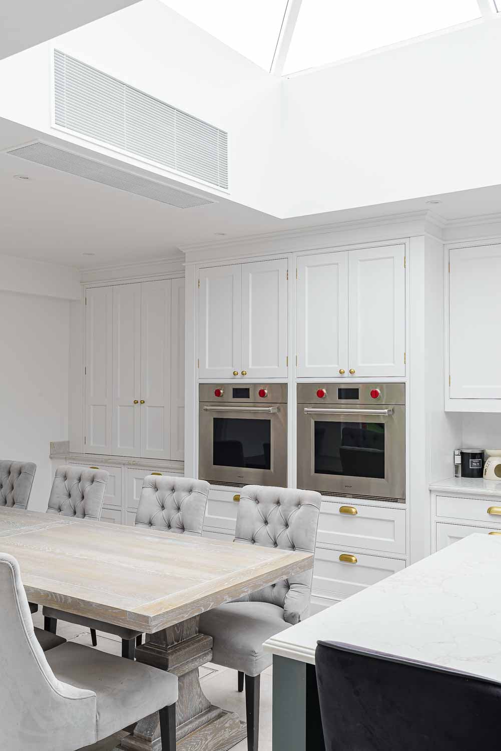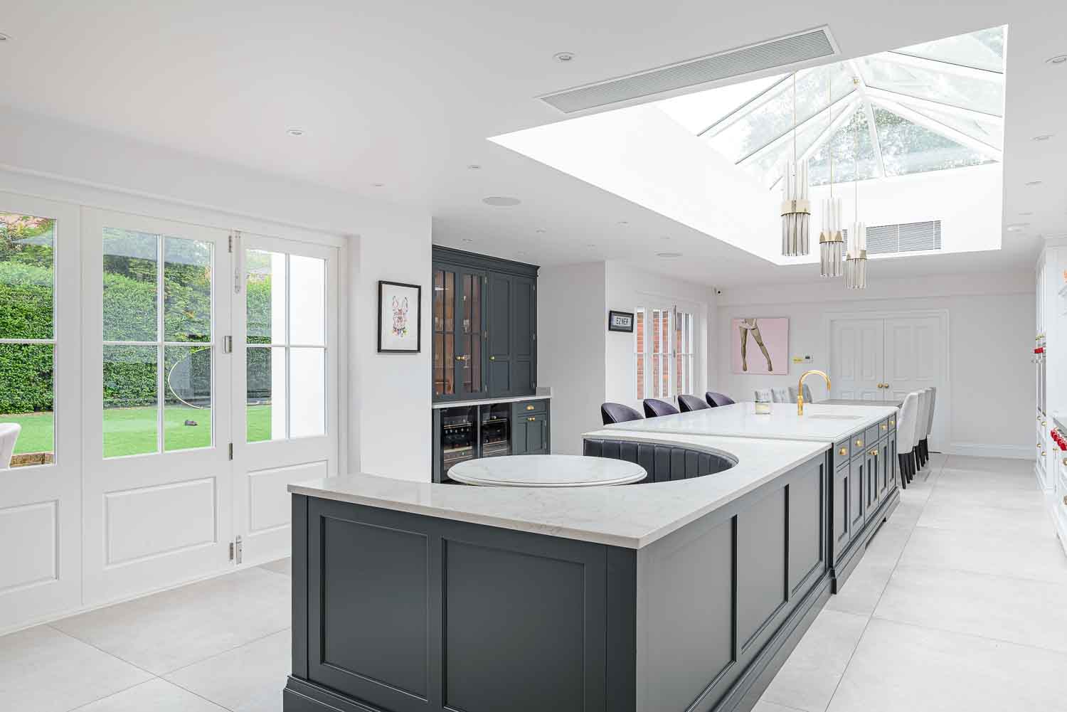 The Statuario Gold worktops with Hilton edge detail add a luxurious touch to the space. High-end appliances include Wolf ovens, Subzero fridges and freezer, a Miele wine cooler, and a Fisher & Paykel fridge drawer, all perfectly complemented by Armac Martin Withenshaw range satin brass lacquered handles.