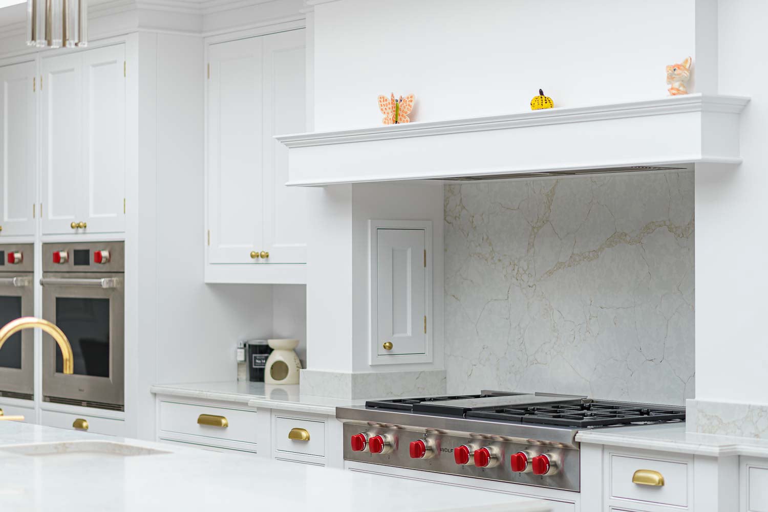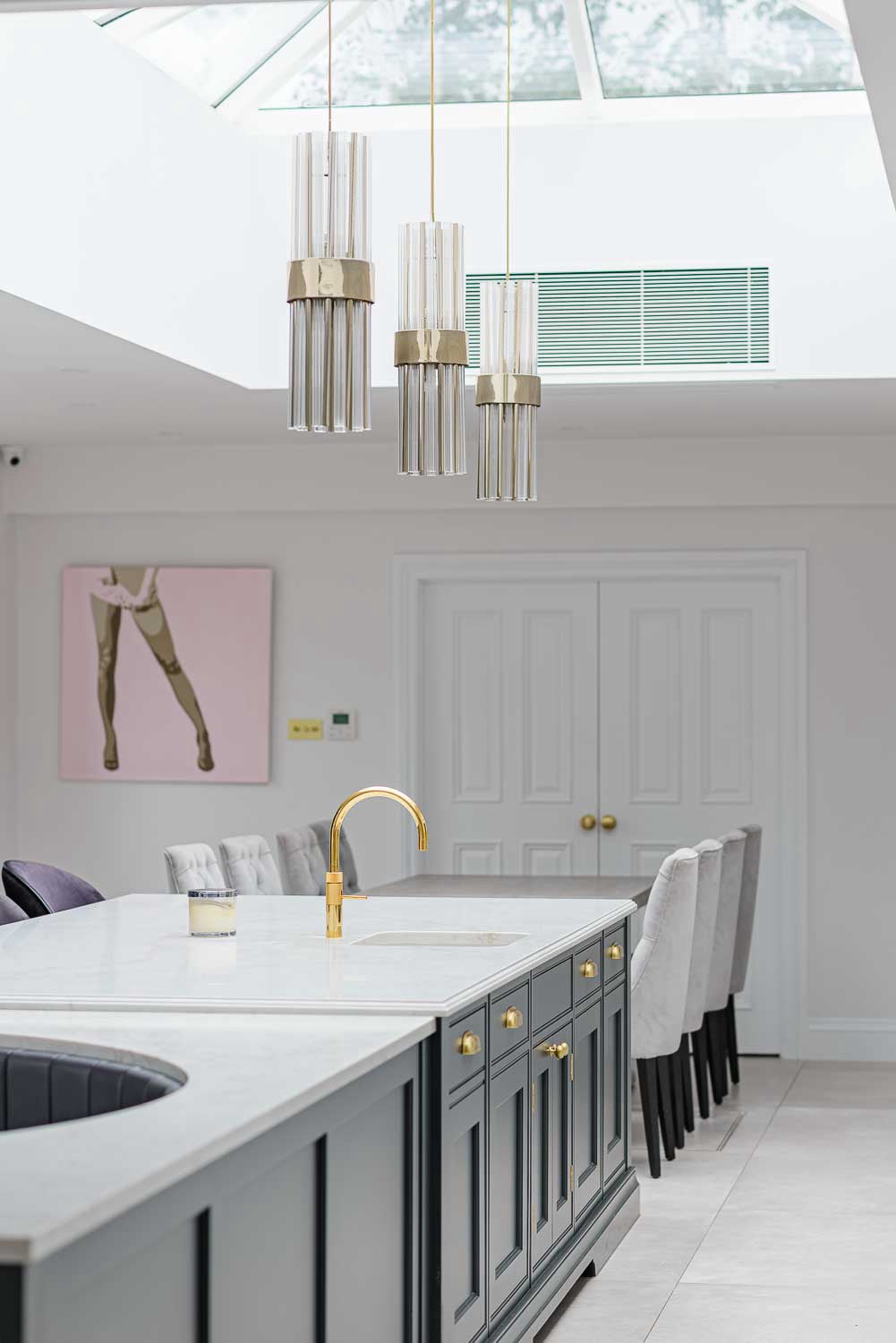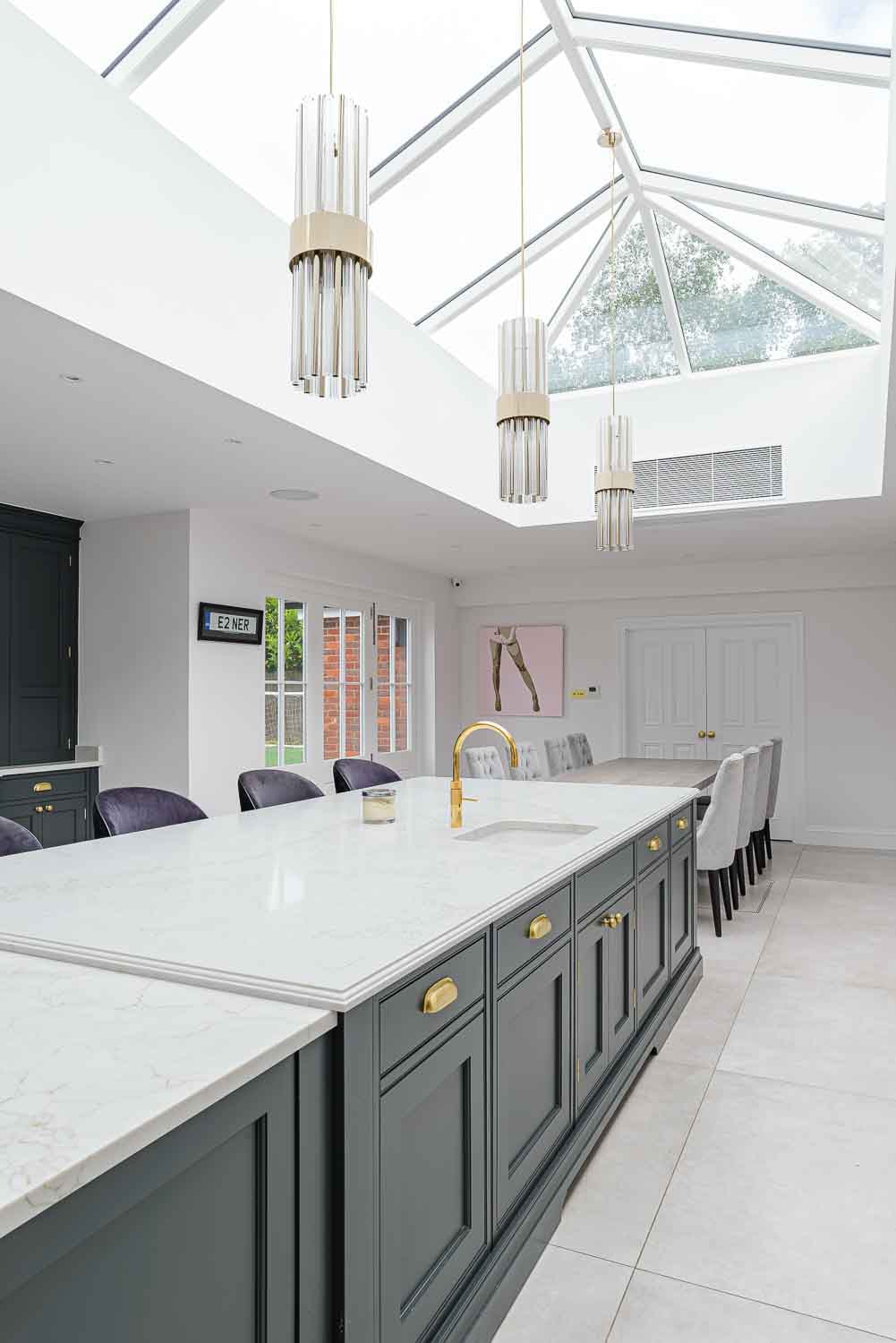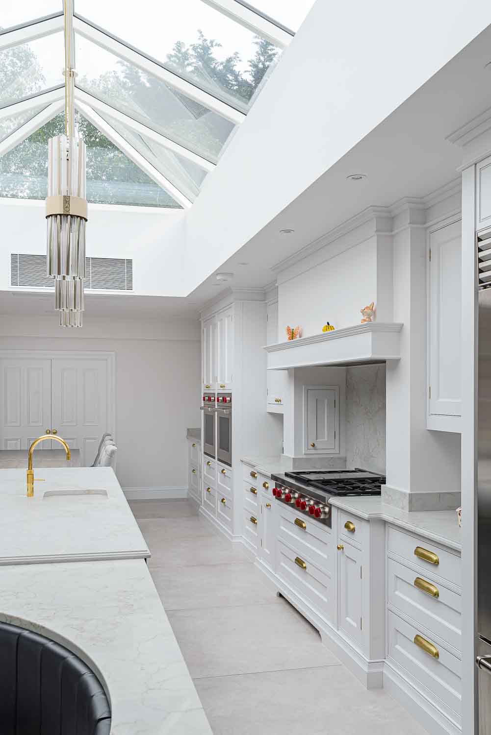 The Statuario Gold worktops with Hilton edge detail add a luxurious touch to the space. High-end appliances include Wolf ovens, Subzero fridges and freezer, a Miele wine cooler, and a Fisher & Paykel fridge drawer, all perfectly complemented by Armac Martin Withenshaw range satin brass lacquered handles.
