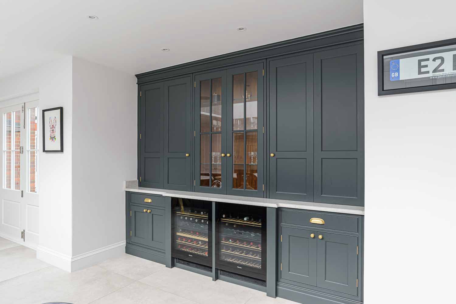 Mark and Anna’s kitchen is a masterpiece of bespoke elegance with our smooth in-frame Shaker design featuring exposed hinges, beautifully finished in F&B Wevet and Little Greene Lamp Black.