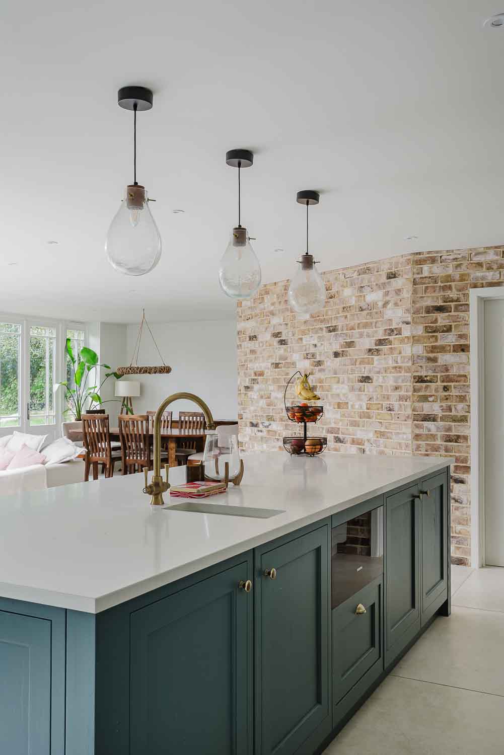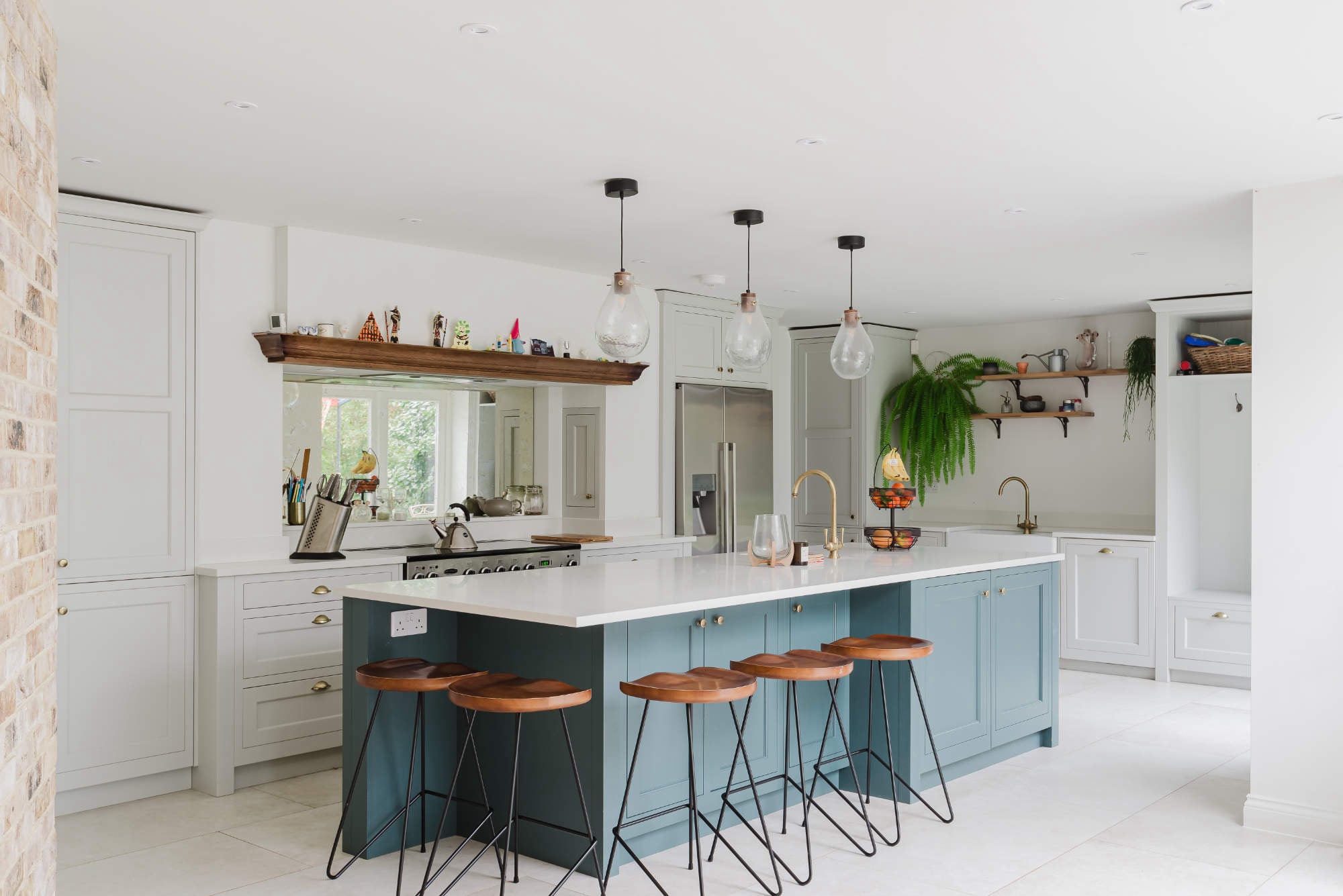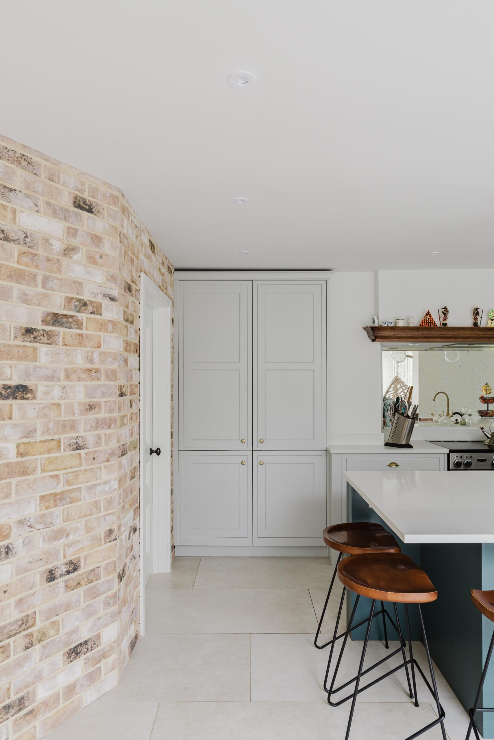 Nick and Emma’s kitchen is a perfect blend of classic elegance and contemporary design. The Belgravia cabinetry in Light Grey brings a timeless charm, while the Viridian island adds a striking contrast, making it the focal point of the space.