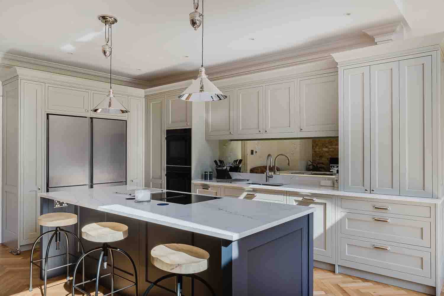Nigel’s kitchen pairs classic design with bold character, featuring our Belgravia in-frame Shaker range in Stone, contrasted by a Slate Blue island for a balanced and timeless look. The polished 30mm Silestone Ethereal Dusk worktops add a refined, modern surface, complemented by an antique mirror splashback for depth and softness.