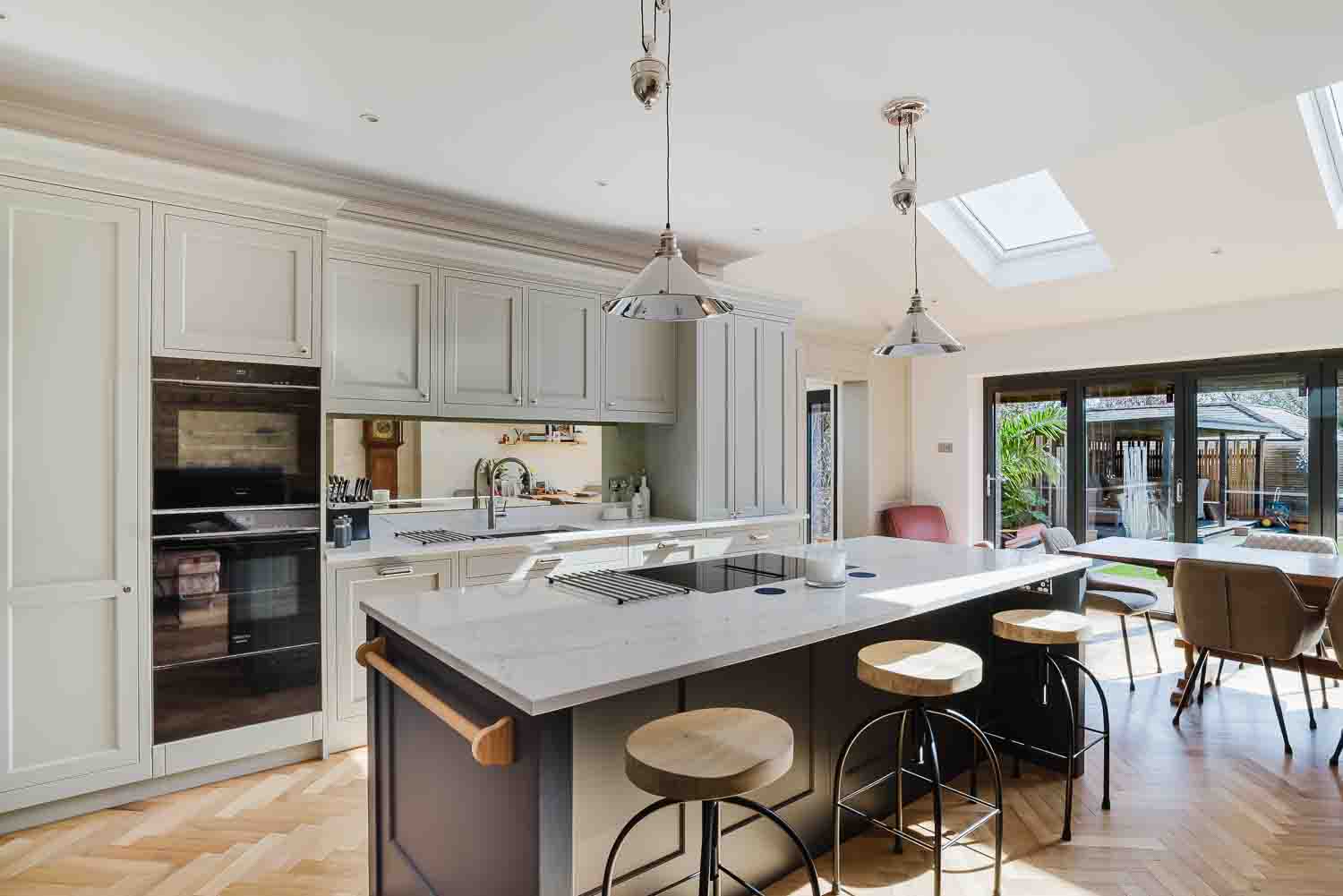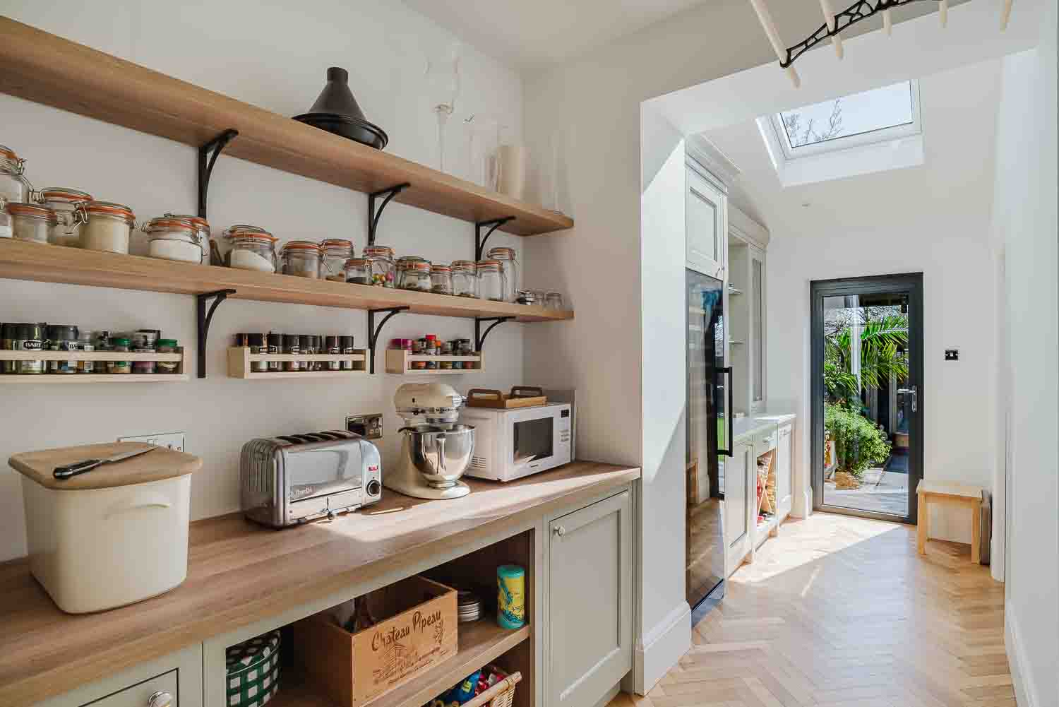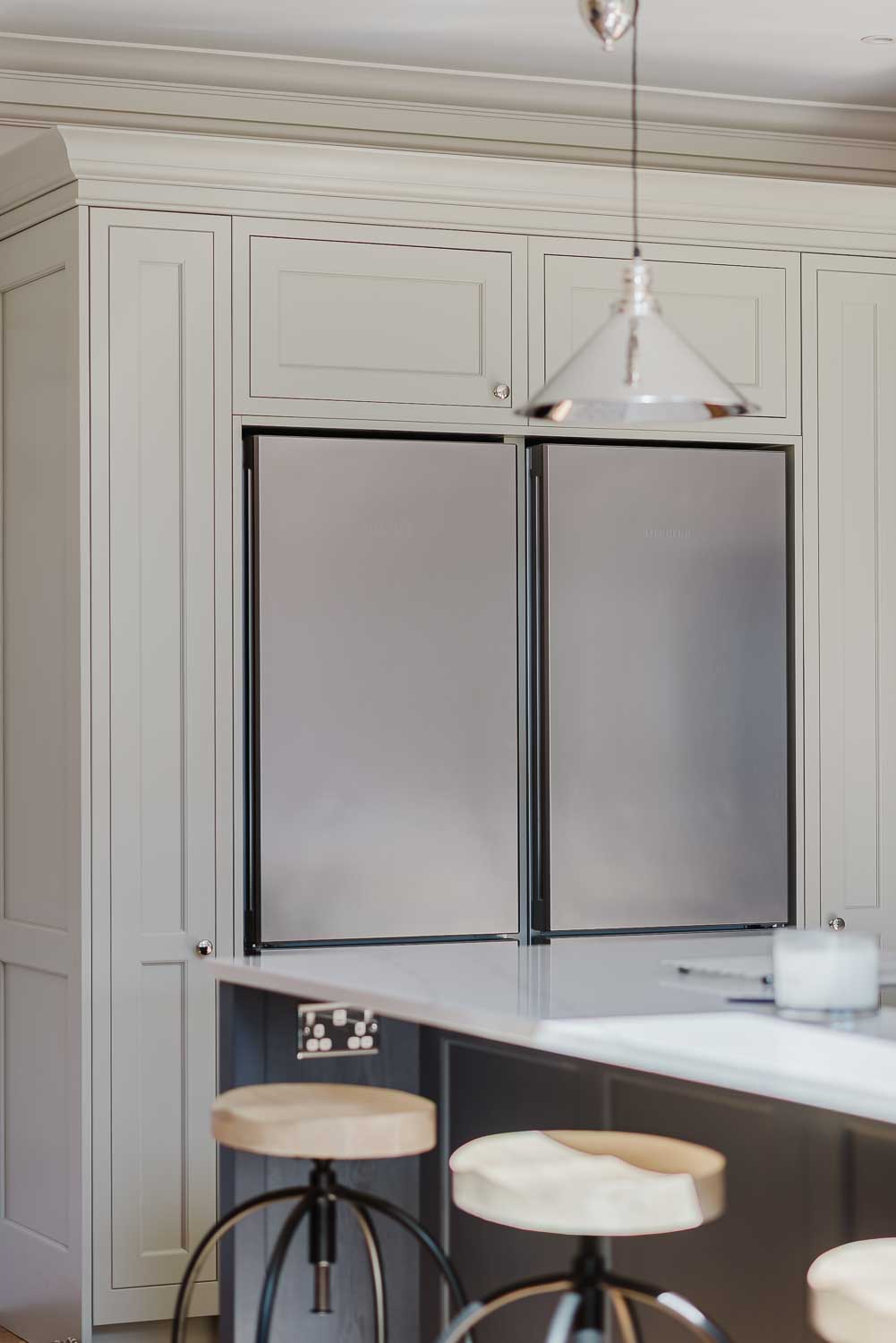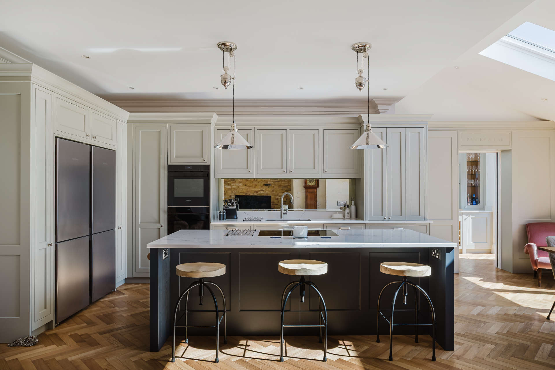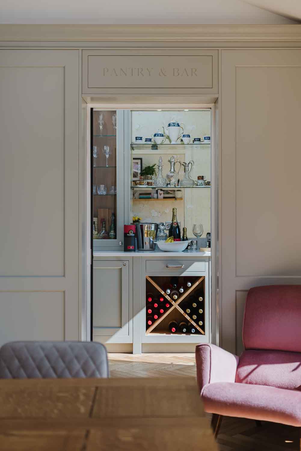 At the heart of the space sits a bifold dresser unit and bespoke bar area with glass shelving and dresser doors, adding both function and charm. Framed wall cladding with engraved detailing to the bar and pantry brings a fully bespoke touch.