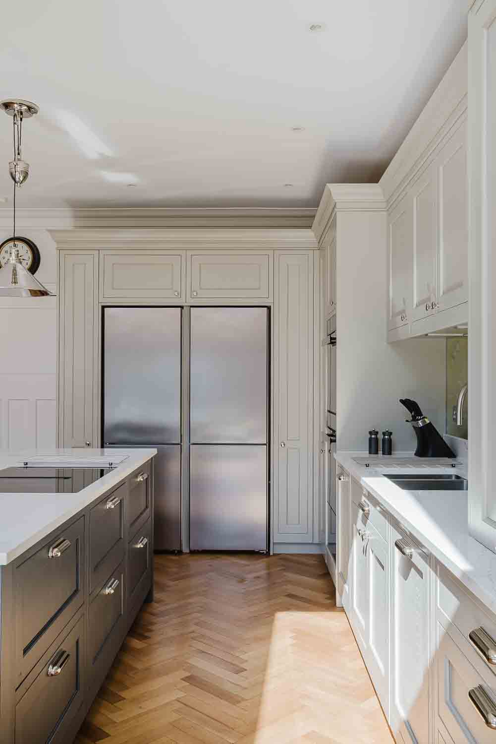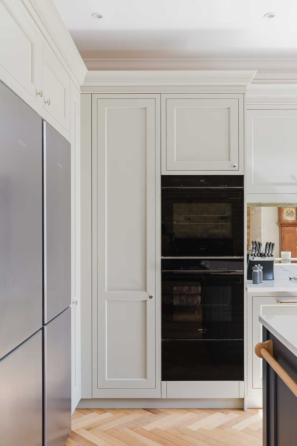 Siemens ovens, a Franke sink, and a Quooker tap offer high-performance practicality, while the LeMans tall corner larder and oak towel rail reflect careful planning. A separate pantry area completes this elegant, fully tailored kitchen.