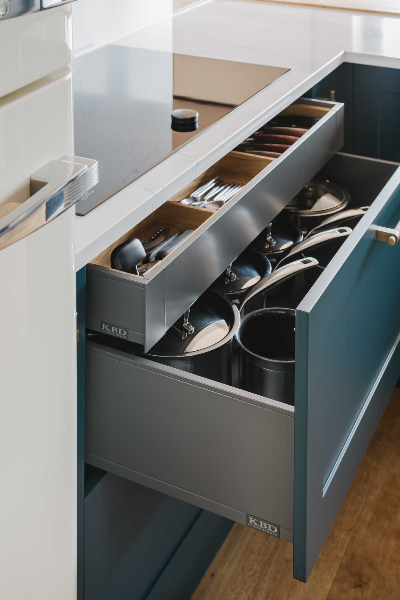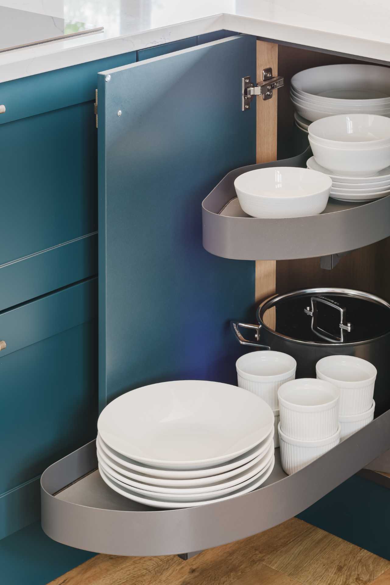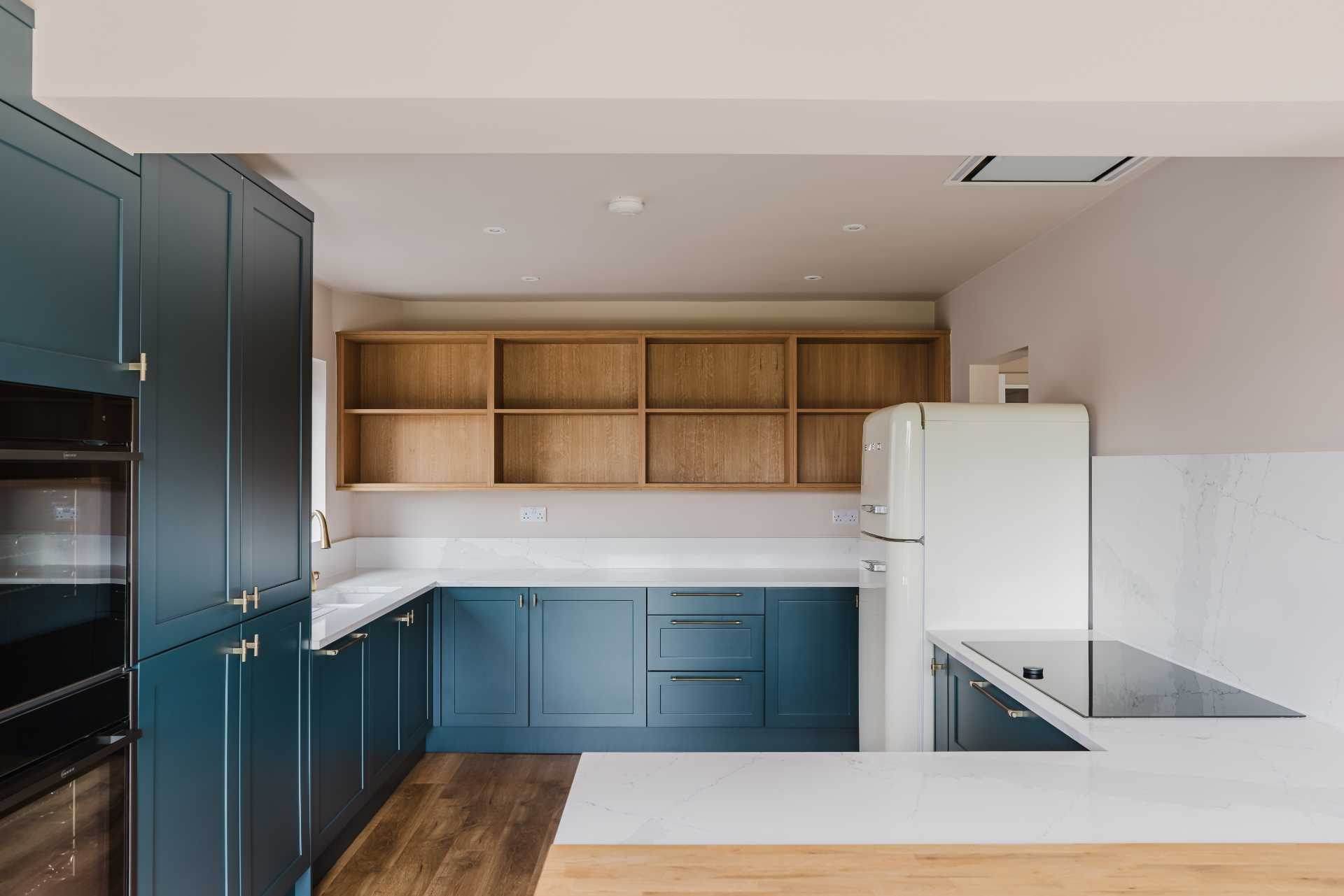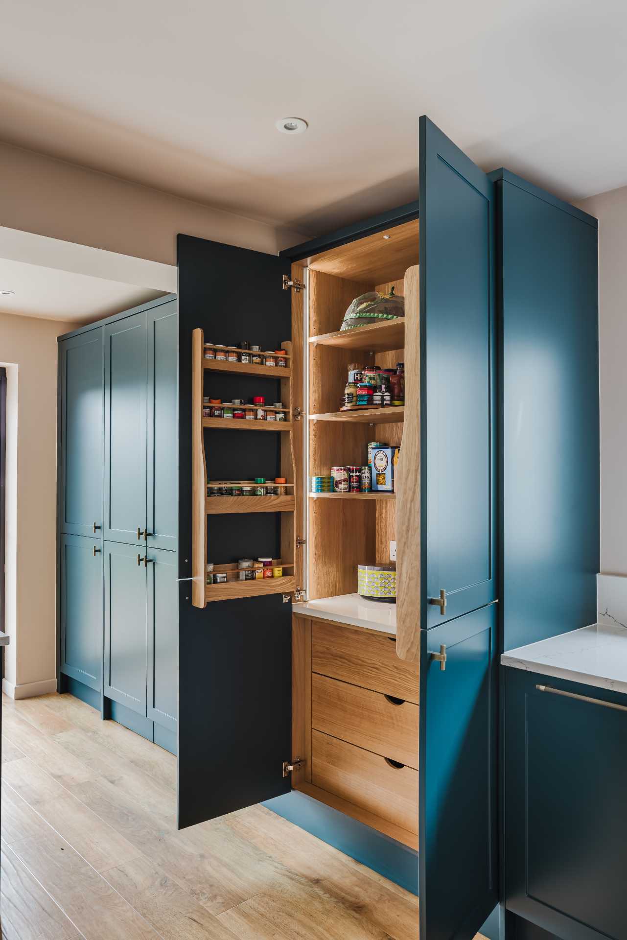 A standout feature is the 1000mm-wide butler’s pantry, offering generous, well-organised storage alongside a LeMans corner base unit and bespoke veneered open shelving that adds a bespoke, handcrafted touch.