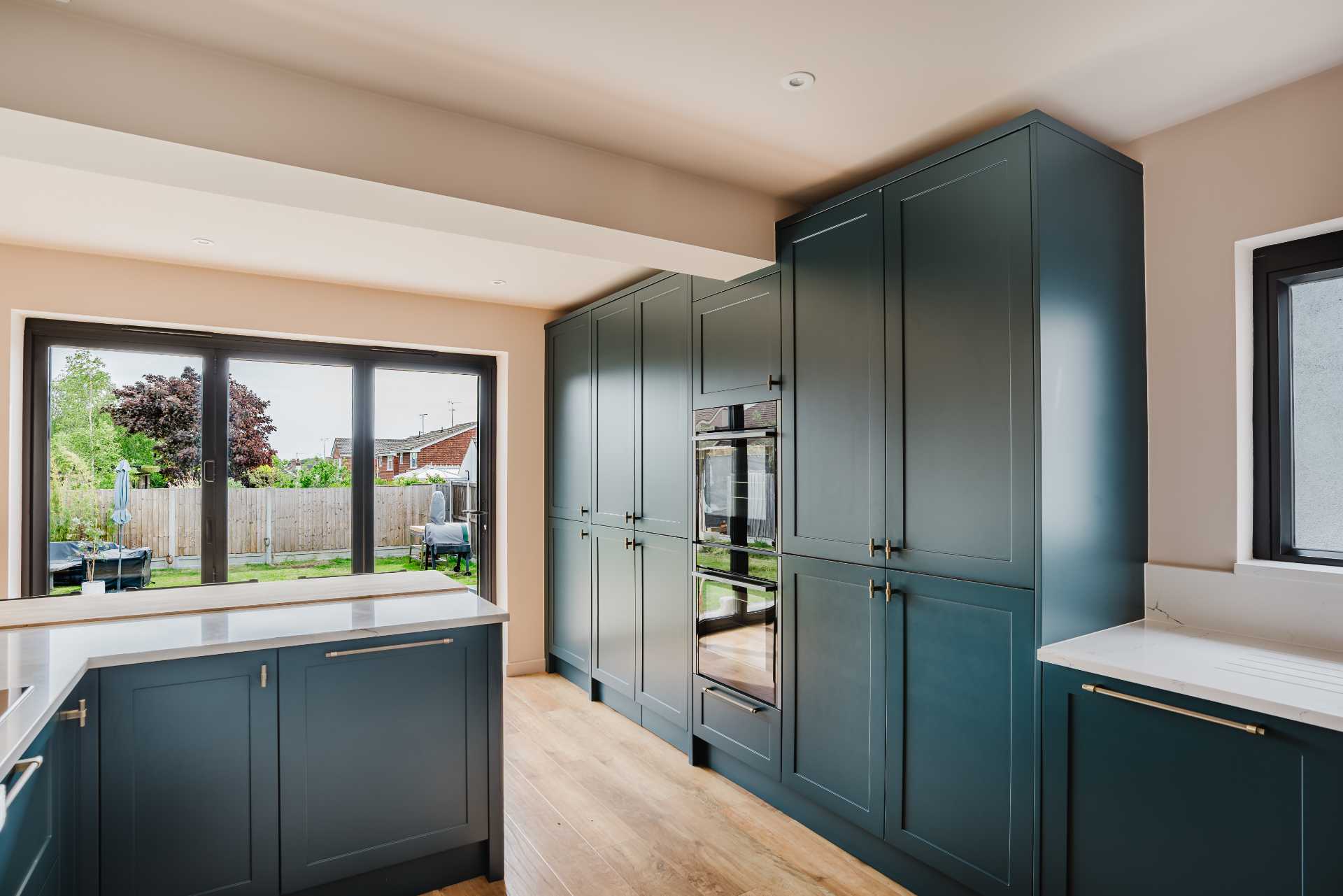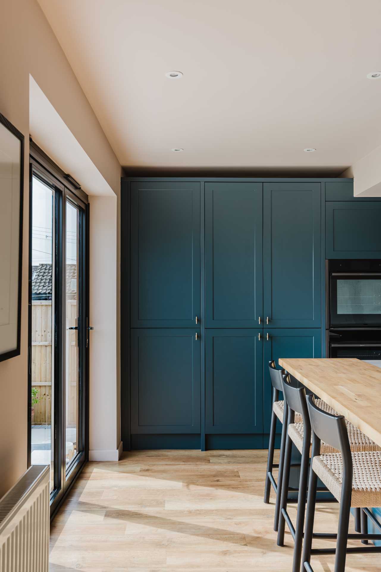 Paul and Louise’s kitchen is a timeless blend of bold colour and warm texture, built around the Clifden range in a smooth Marine finish. The narrow shaker style brings a clean, elegant feel, while the solid oak block worktops from De Terra add natural charm and warmth.