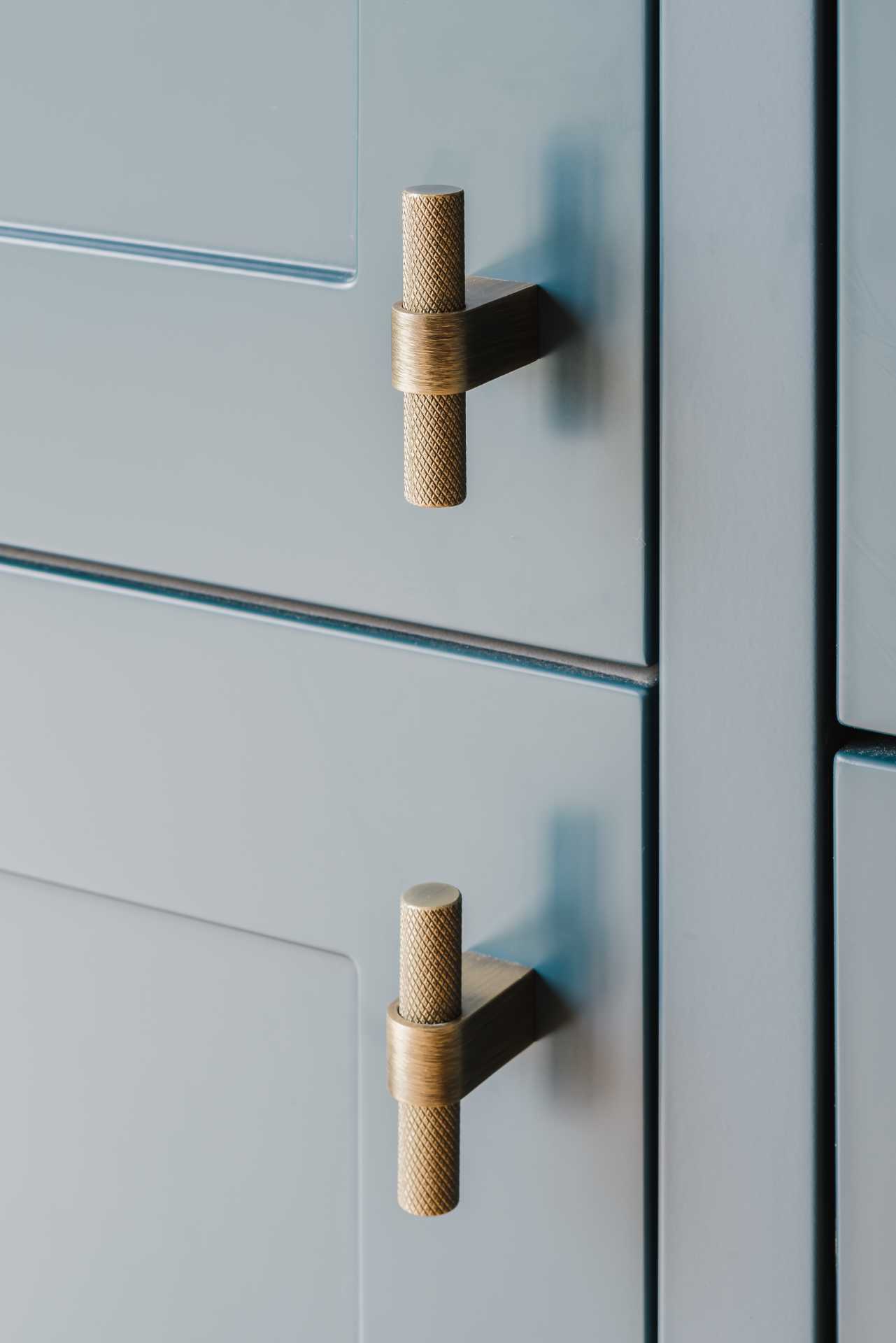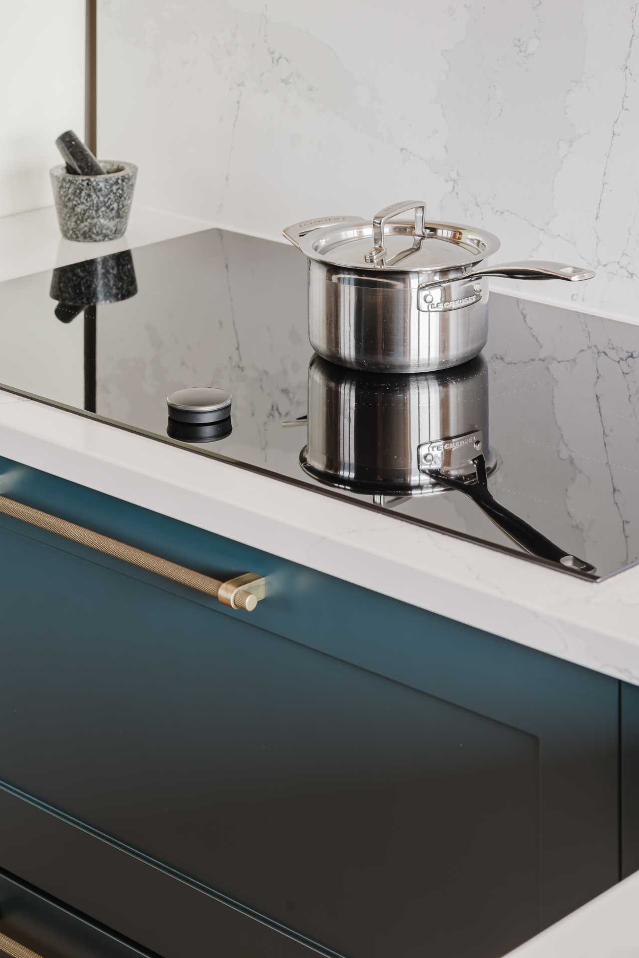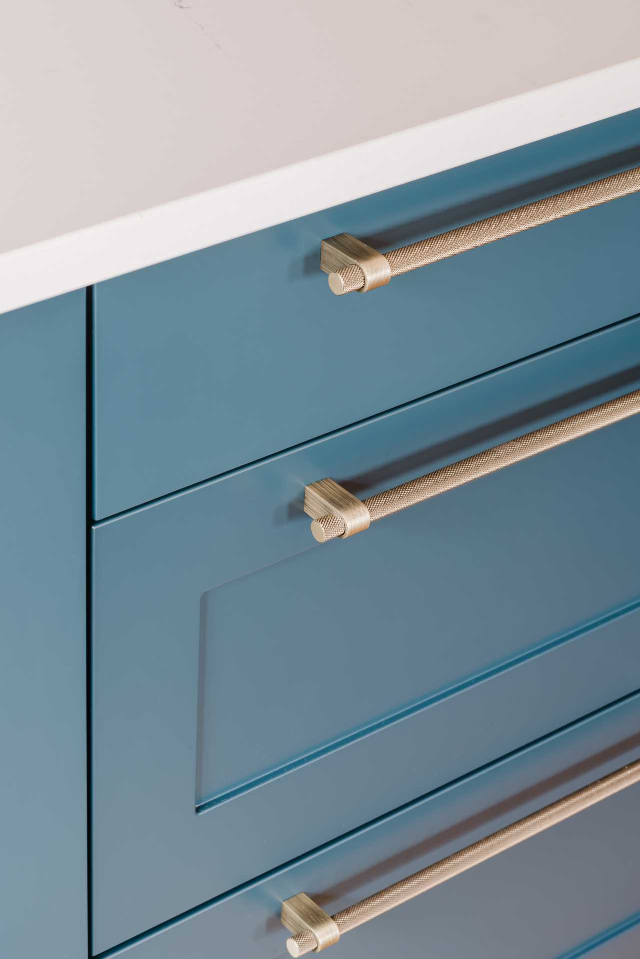 A 30mm Silestone quartz worktop in Ethereal Dusk creates a soft contrast, with delicate veining that lifts the palette. Antique brushed brass knurled T-bar handles run throughout, adding vintage detail with a tactile edge, perfectly complementing the deep blue cabinetry.