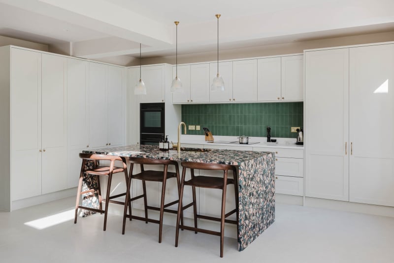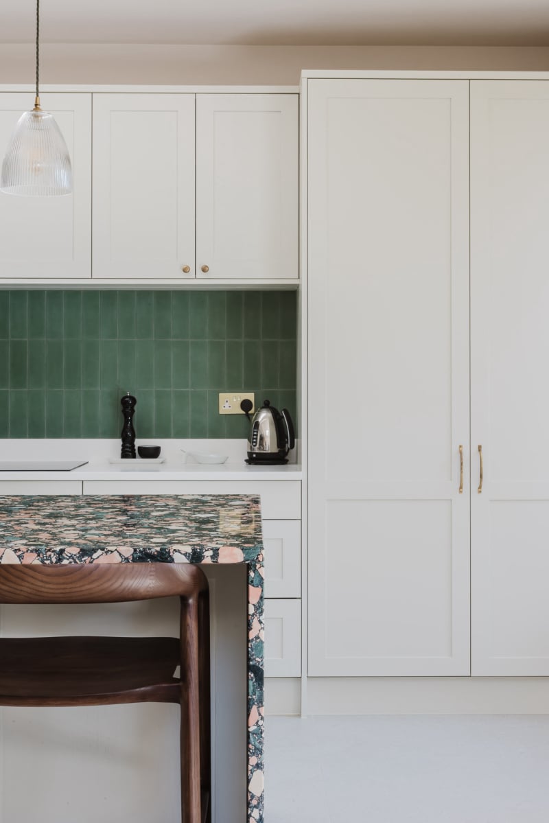 Surfaces are finished in 30mm Terrazzo quartz, introducing subtle pattern and tactile interest, while the brass knobs from Rowen & Wren bring a warm, thoughtful accent. The sink and tap, sourced by Chloe from ABI, add a personal touch to the design, perfectly completing the look.