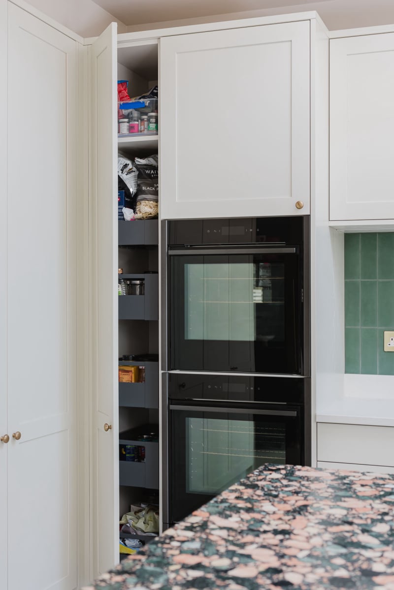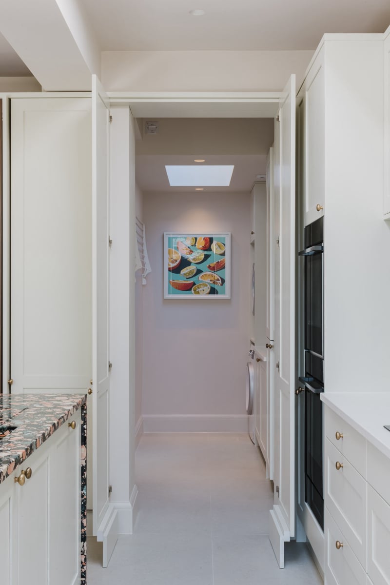 In the adjoining utility, the same Aldana cabinetry continues for consistency, paired with a generous 1000mm shelved larder for practical storage. A white Caple Ettra undermount sink complements the scheme, ensuring the utility is every bit as refined and functional as the main kitchen.