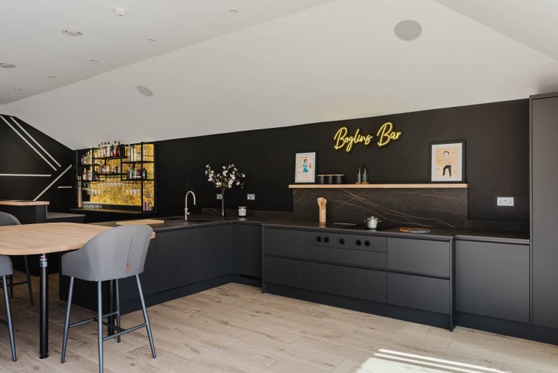 A solid wood breakfast bar introduces natural texture and contrast, softening the bold graphite cabinetry and offering a welcoming spot for casual dining or conversation. The design is elevated further by a Quooker tap in stainless steel, bringing instant hot water with cutting-edge functionality, perfectly in keeping with the streamlined aesthetic.